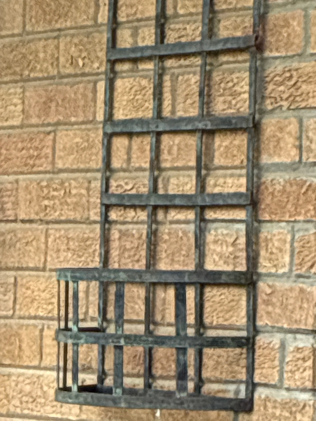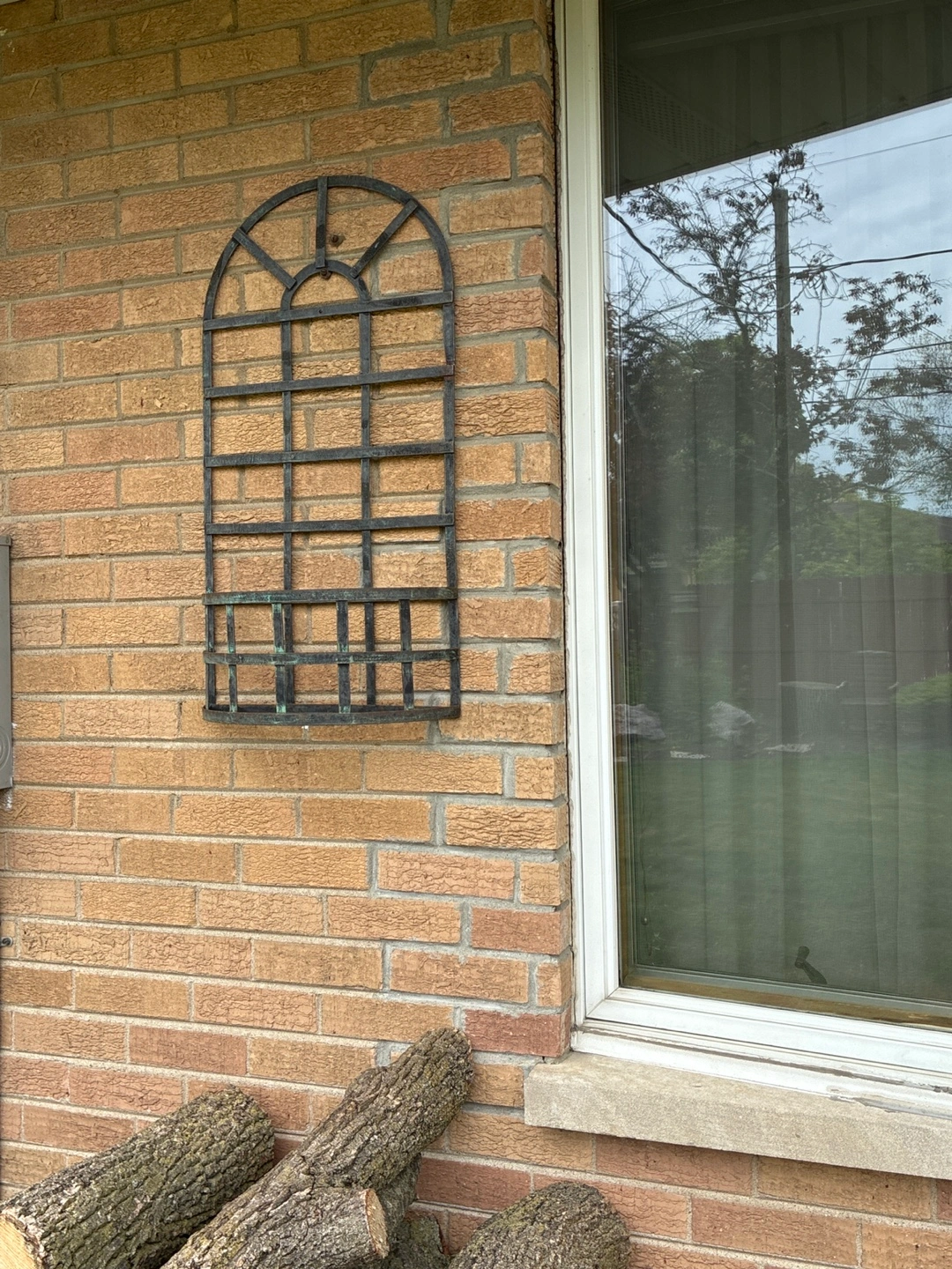 Unique arched metal wall decor. Features a small shelf at the bottom. Great for indoor or outdoor use. Shows some wear consistent with age. Great rustic look! Such a cute and sturdy piece for any home!