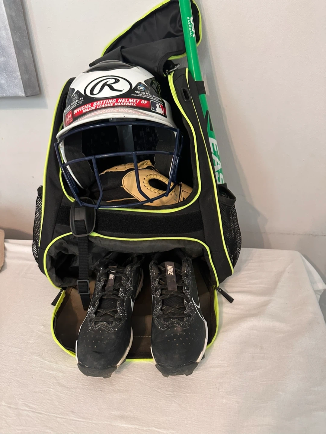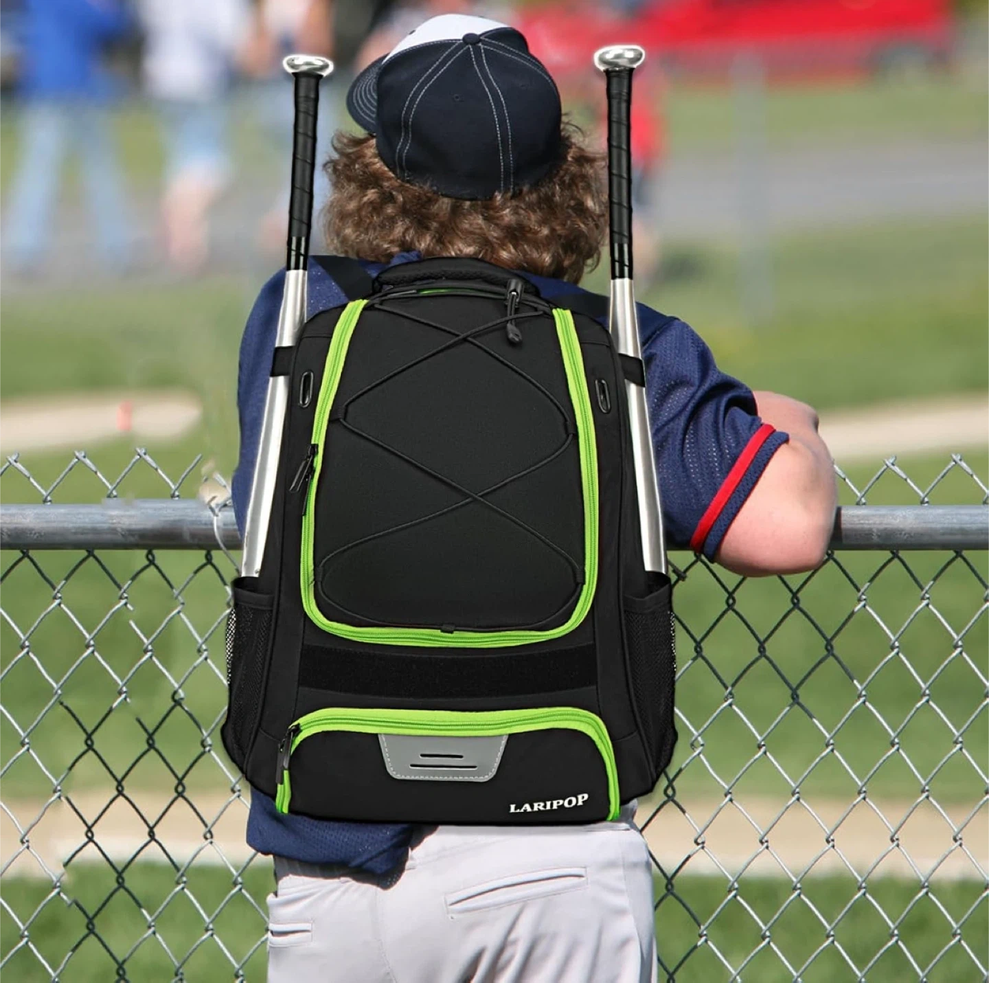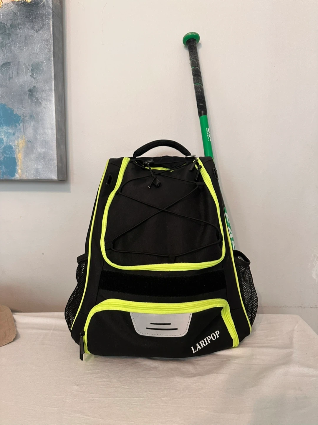 This LARIPOP baseball bat backpack is perfect for carrying all your gear to the field! It features a large main compartment, a cleats pocket, and can hold bats, gloves, and helmets. The backpack is black with neon green accents and measures approximately 18.5 inches tall, 13.4 inches wide, and 7.6 inches deep. It's roomy but not bulky! All items are sold separately. This listing is only for the backpack. Pick-up and cash only.