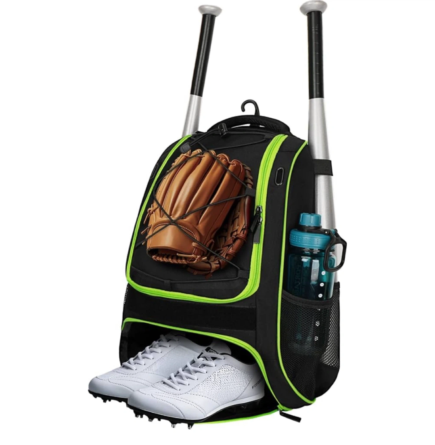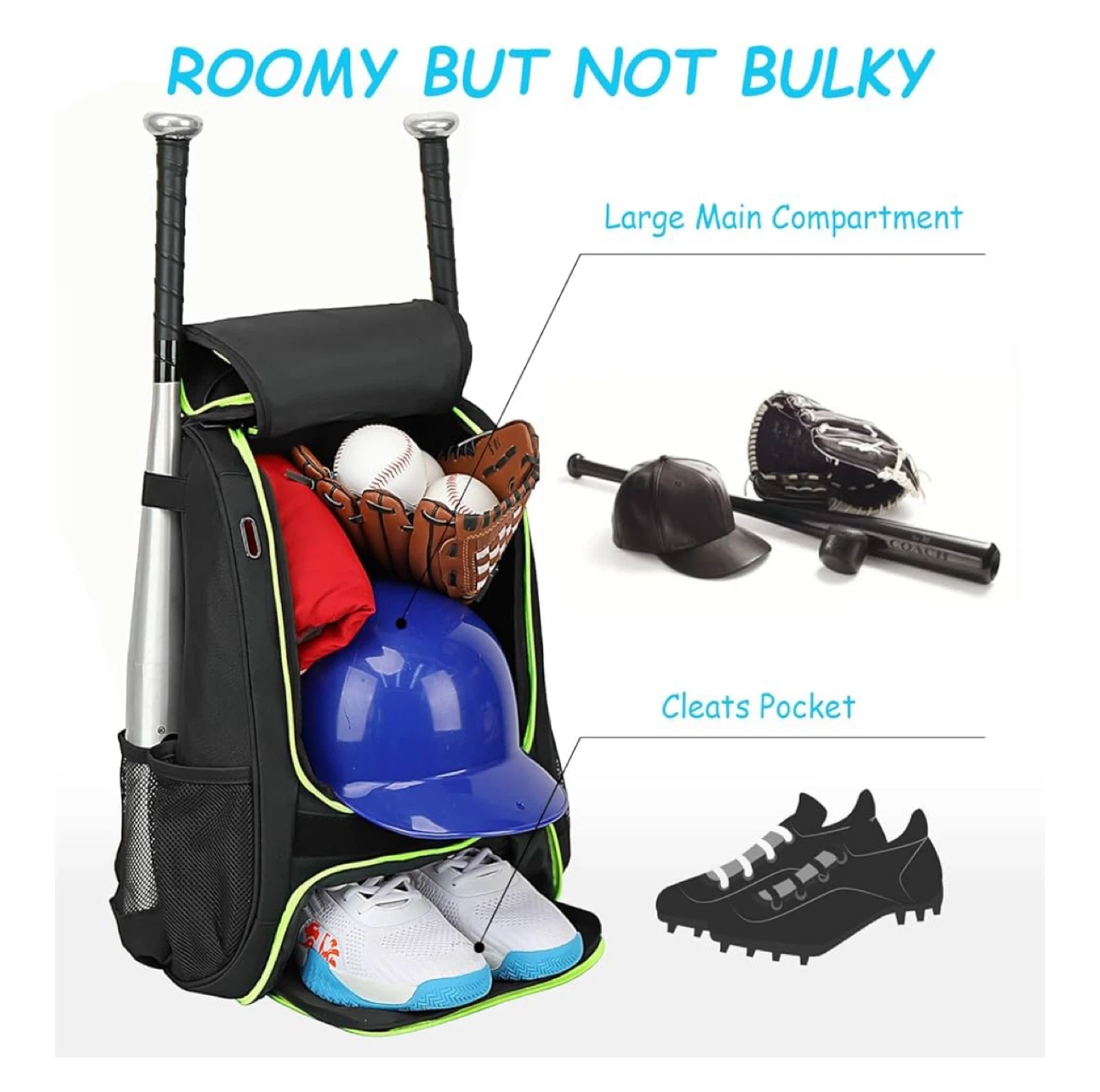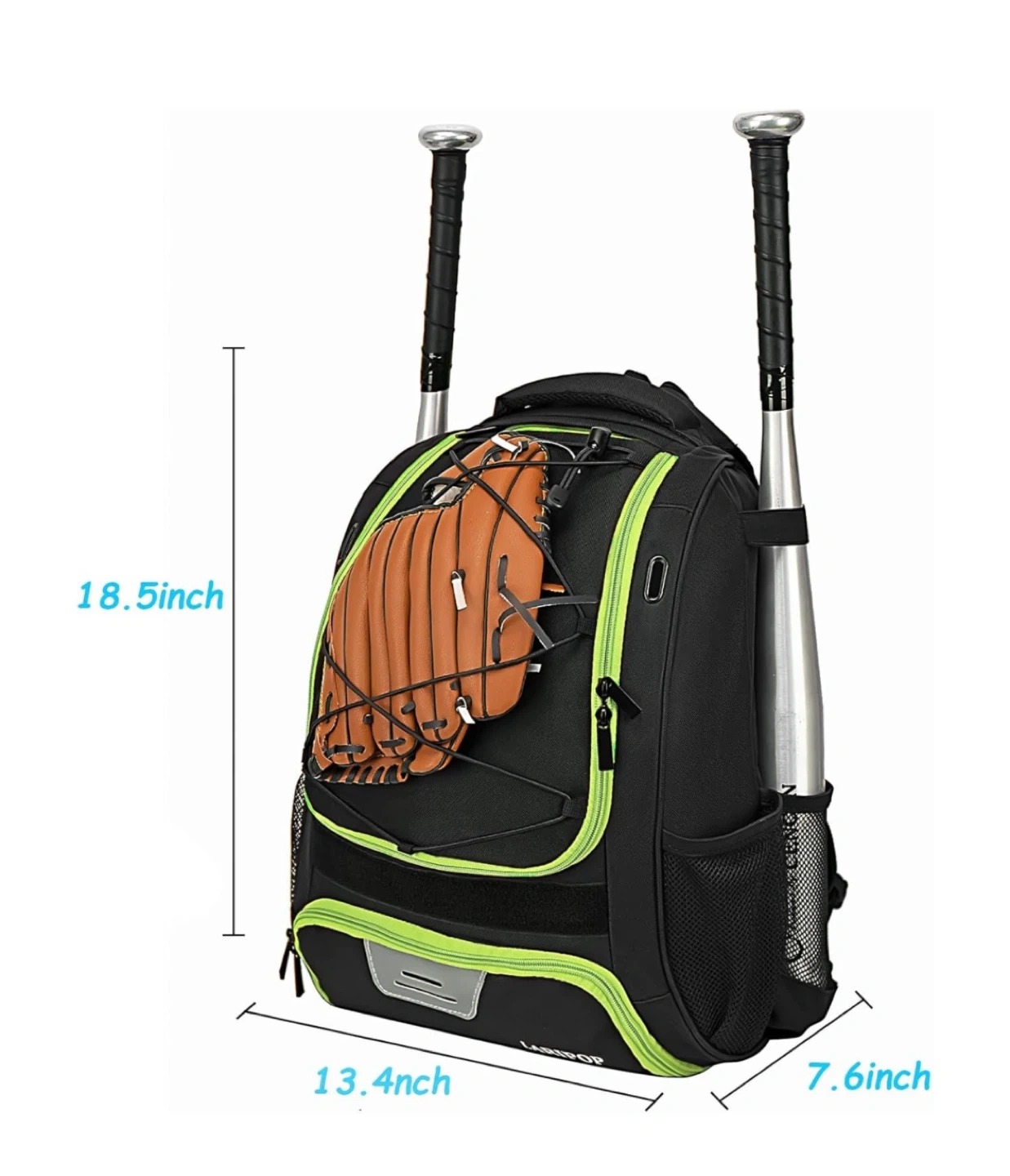 This LARIPOP baseball bat backpack is perfect for carrying all your gear to the field! It features a large main compartment, a cleats pocket, and can hold bats, gloves, and helmets. The backpack is black with neon green accents and measures approximately 18.5 inches tall, 13.4 inches wide, and 7.6 inches deep. It's roomy but not bulky! All items are sold separately. This listing is only for the backpack. Pick-up and cash only.