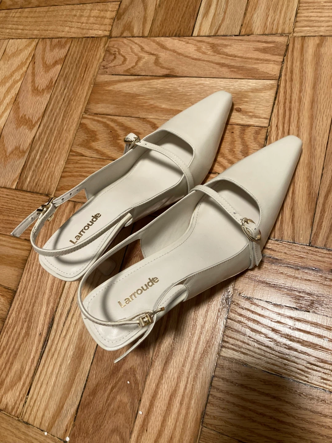 Larroude Ines Pump in Ivory Leather - retail price $330. These kitten heels are a beautiful off-white color and feature a delicate slingback strap. Perfect for dressing up or adding a touch of elegance to a casual outfit. Fair warning though, these are not long distance walking shoes! Worn maybe 3 times, still in very good condition.