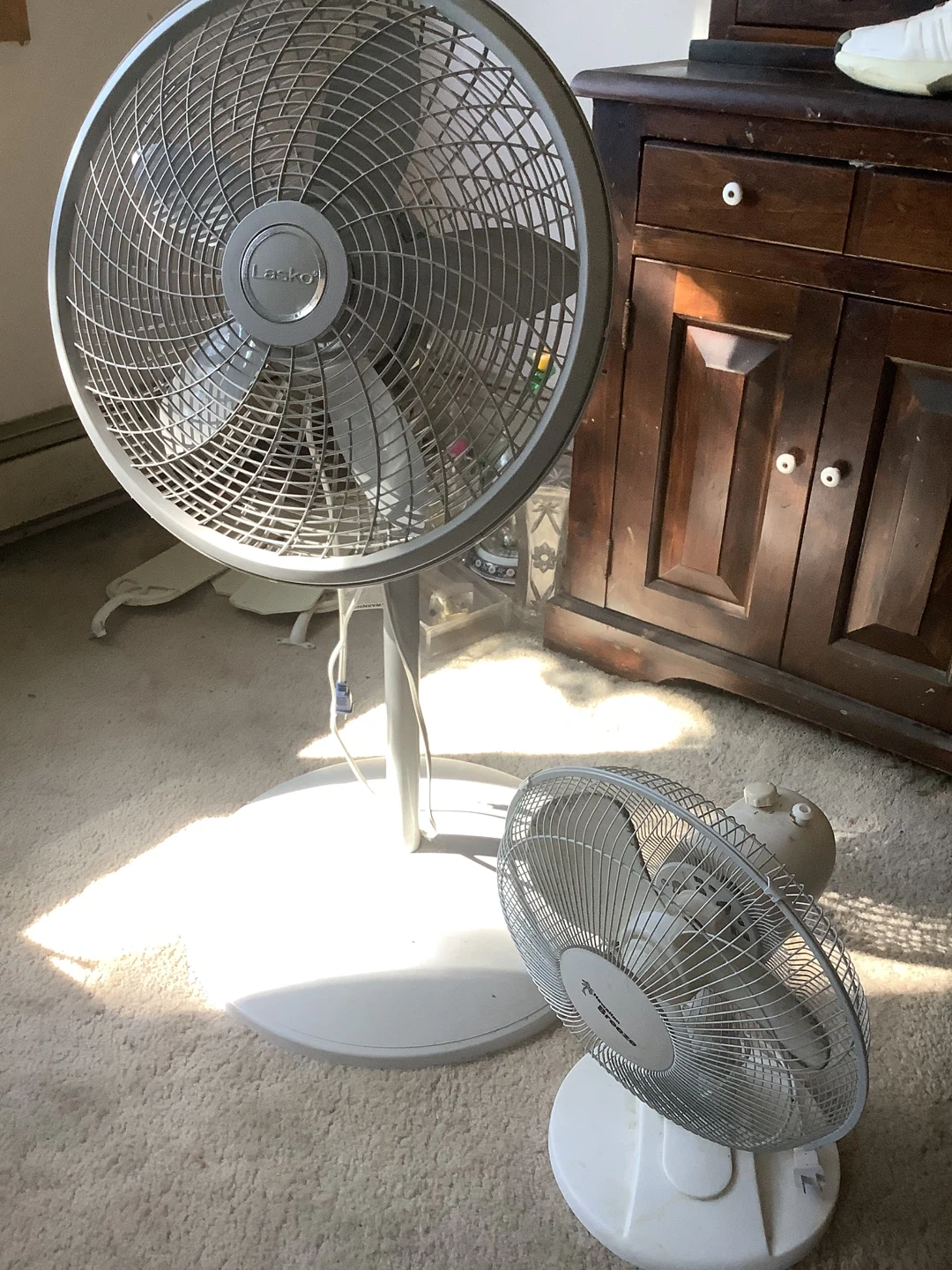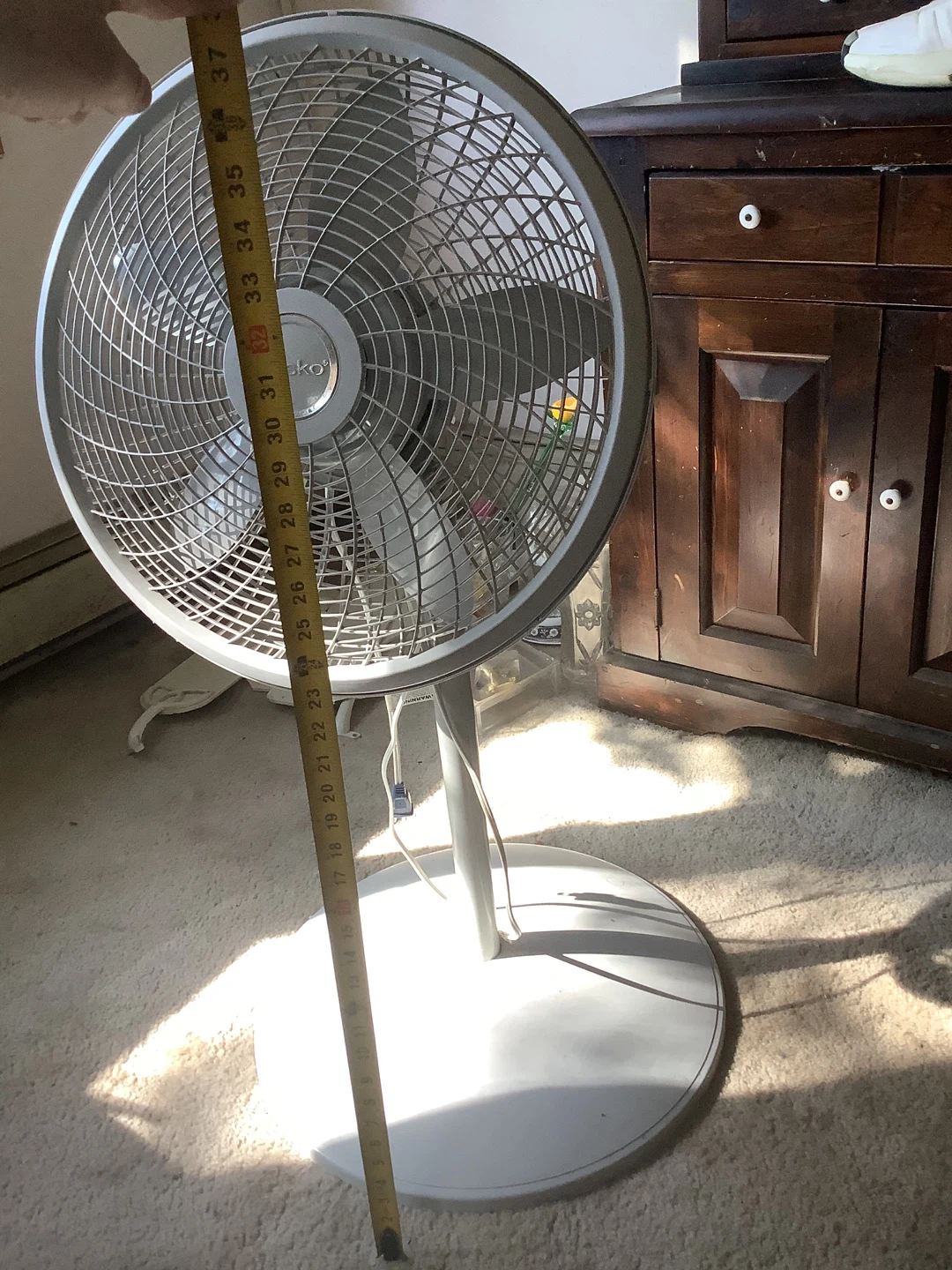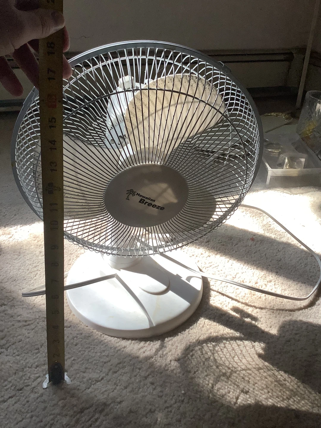 Selling a Lasko stand fan and a Hawaiian Breeze table fan as a bundle. The Lasko fan stands approximately 37 inches tall, and the Hawaiian Breeze fan is about 18 inches tall. Both are in good working condition!