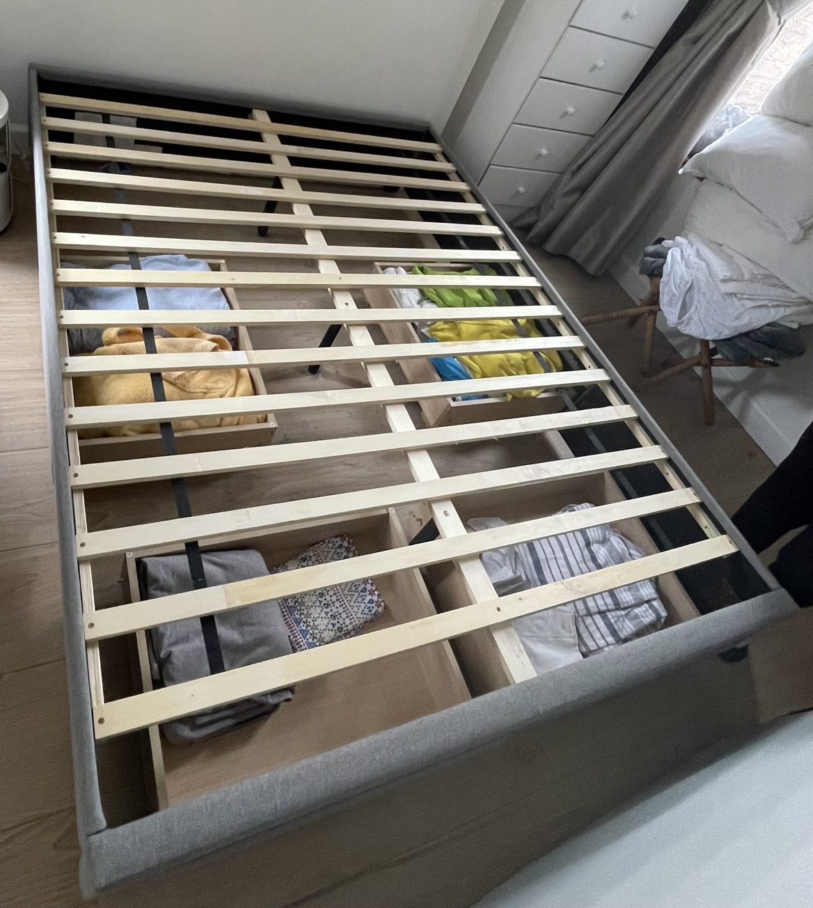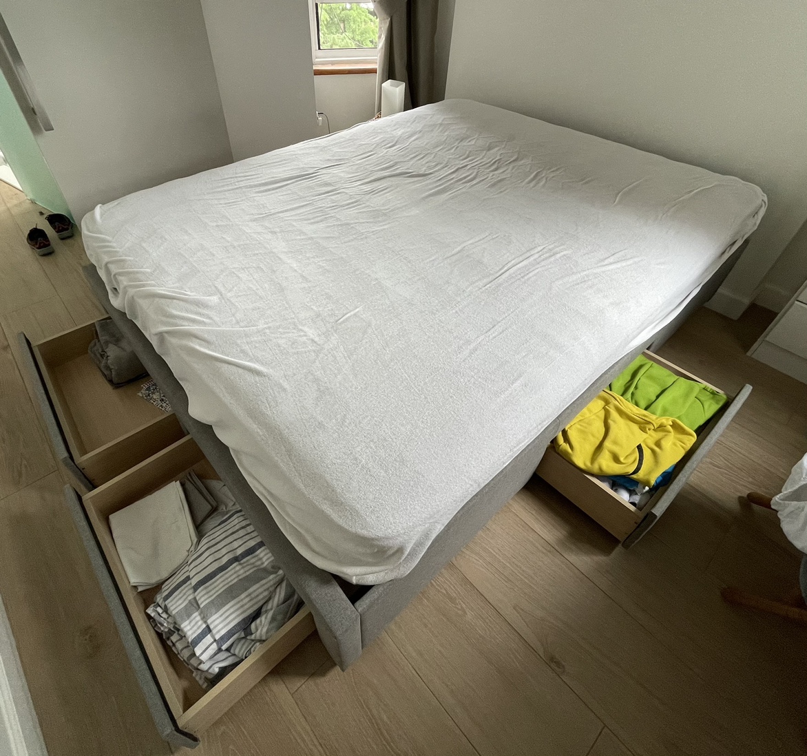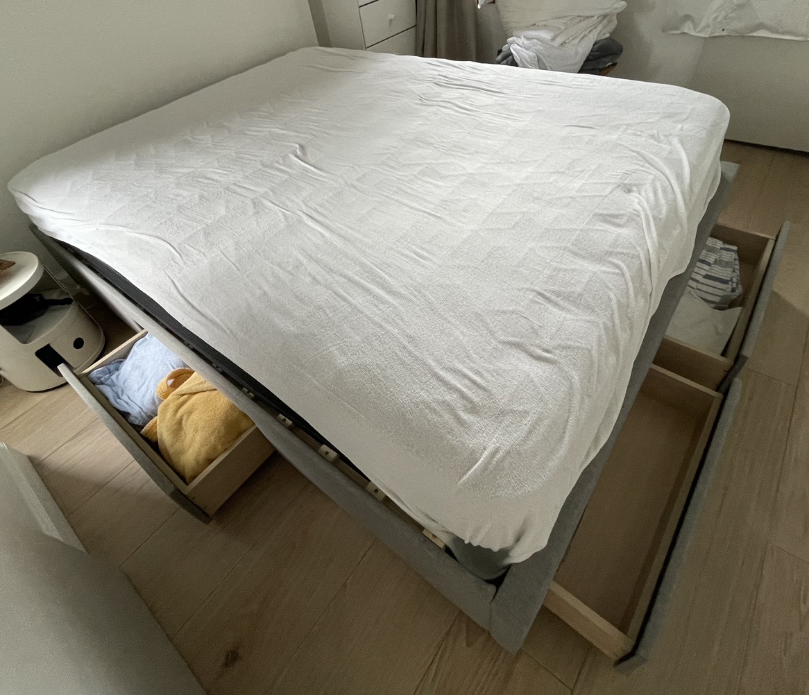 Bed frame for queen size Length 84 inches Widths 62 inches Storage drawer length 20 inches Storage : 4 drawers Pick up in west village with elevator I can provide dissembled if you pick up the 29th or 30th the latest
