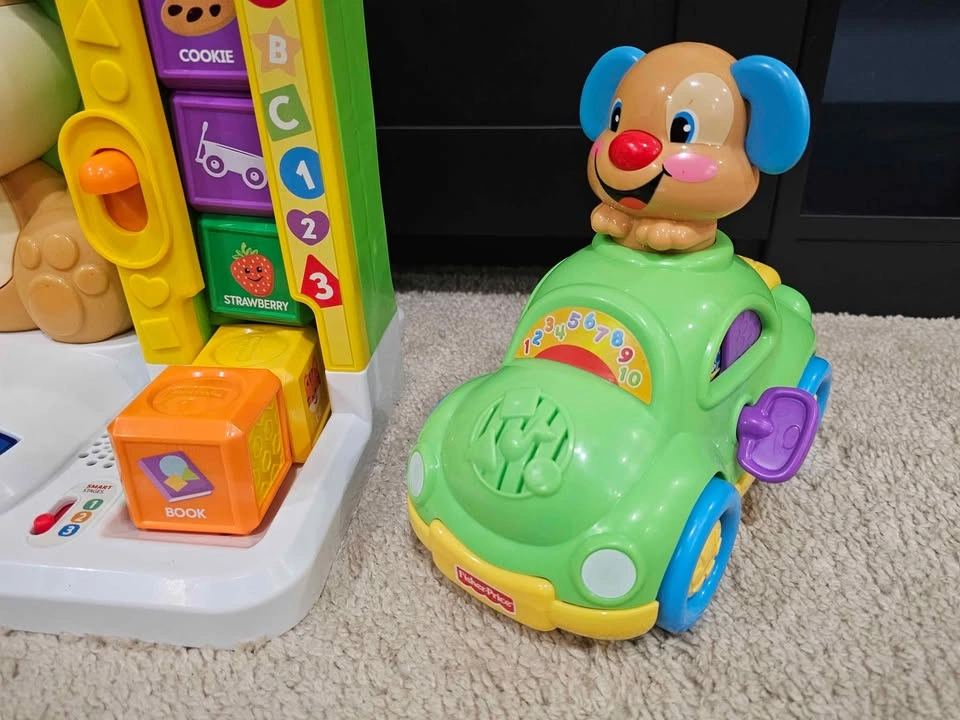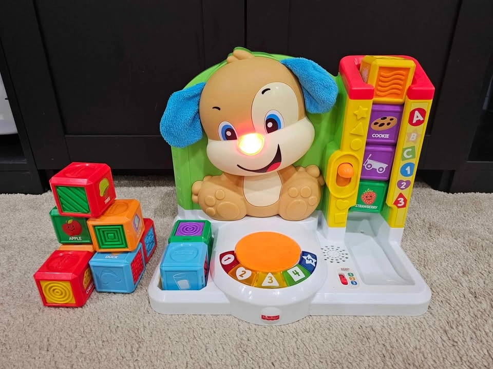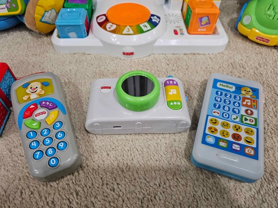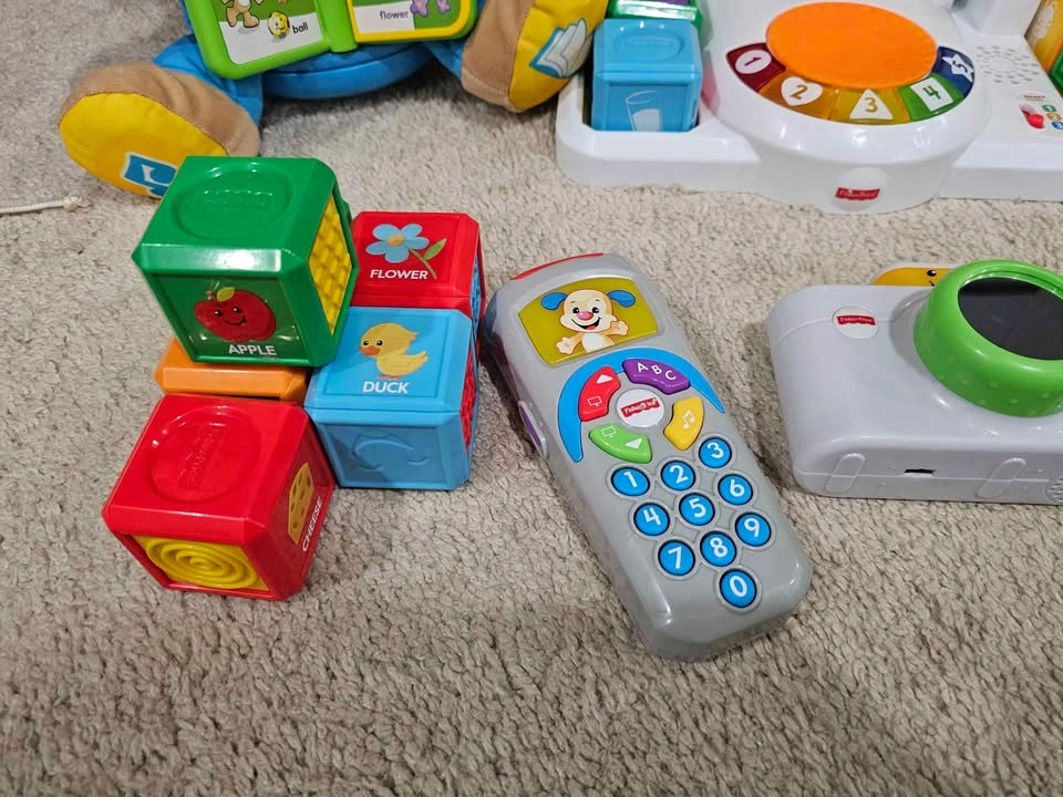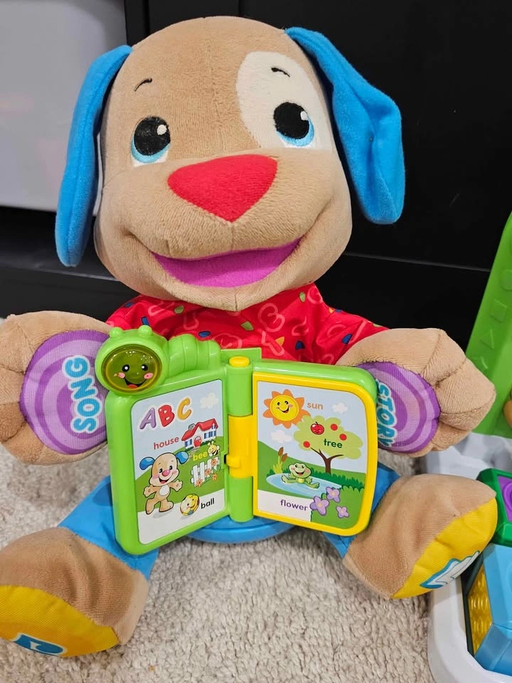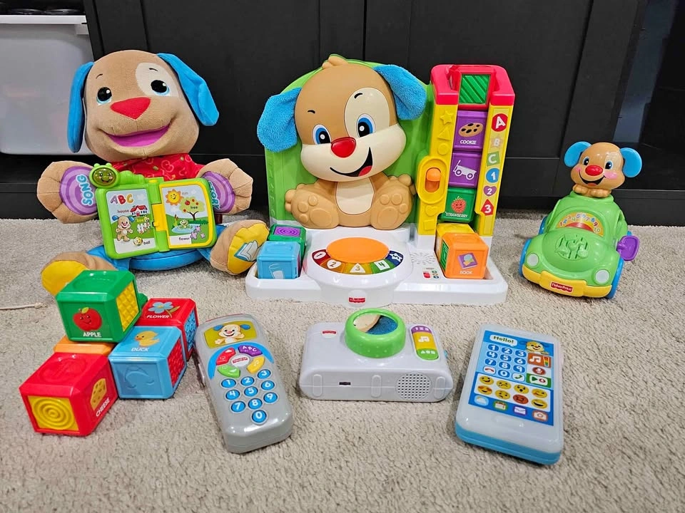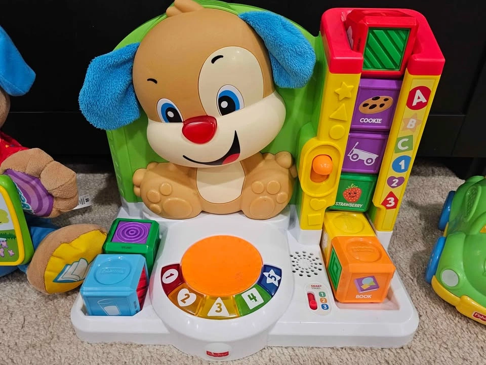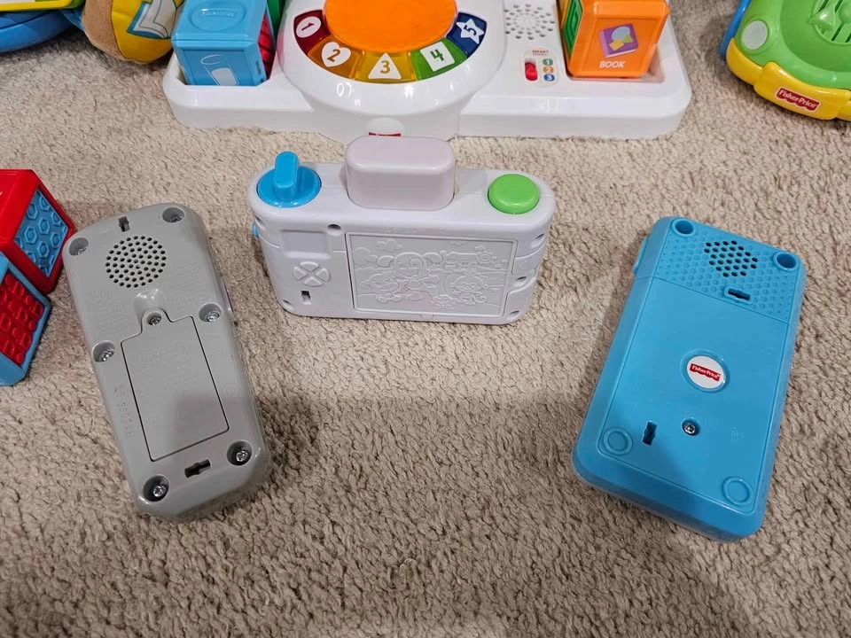 Priced individually below: Laugh and Learn Puppy first words smart puppy and purchased extended set of blocks - $20 Laugh and Learn Puppy Storytime - $10 Laugh and Learn Puppy Remote - $4 Fisher Price Click and Learn Camera - $4 Laugh and Learn Car - $5 Laugh and Learn Baby Phone - $4 Batteries not included Smoke-free, Dog Friendly Home Pick-up in Naperville, IL