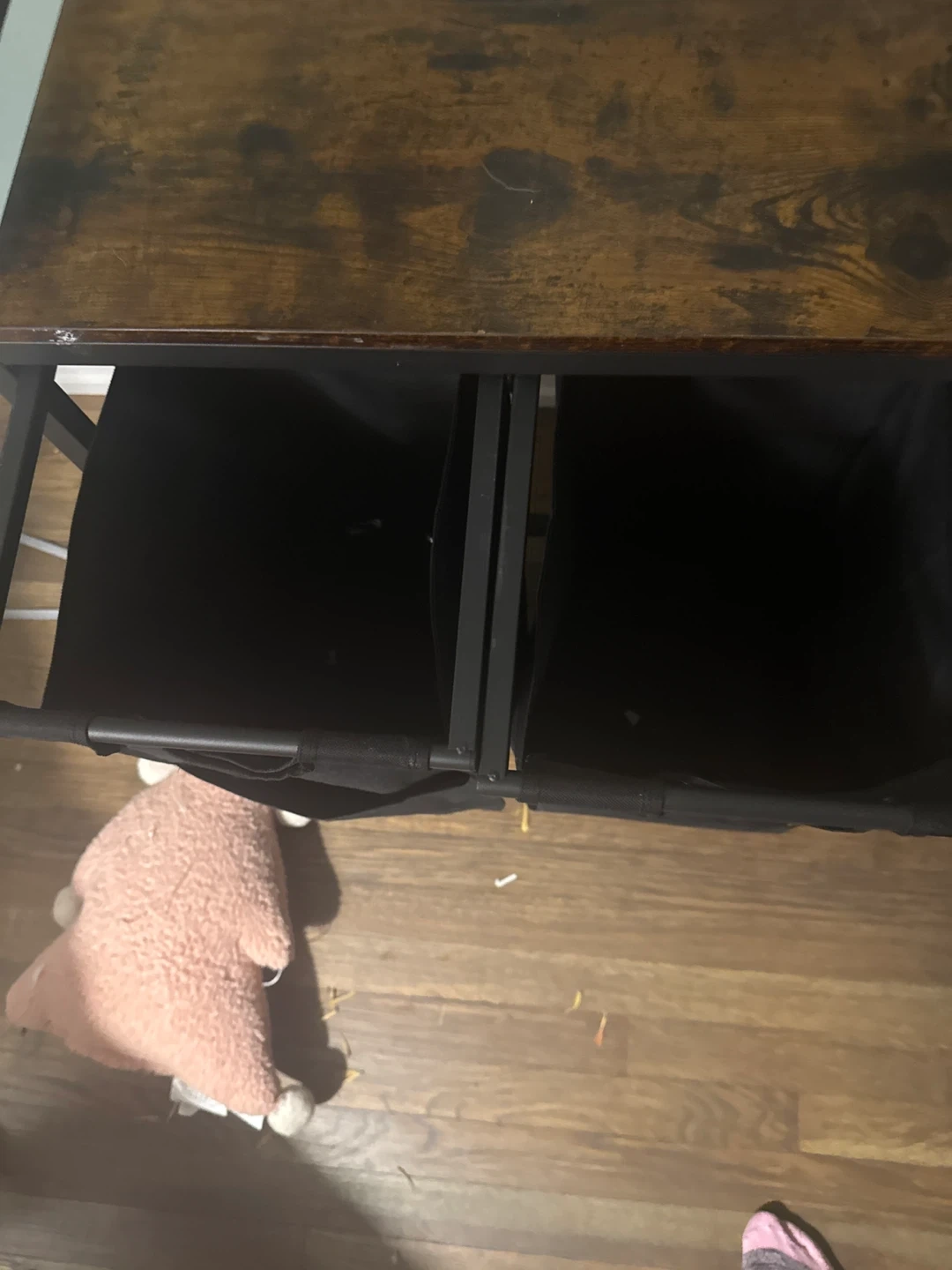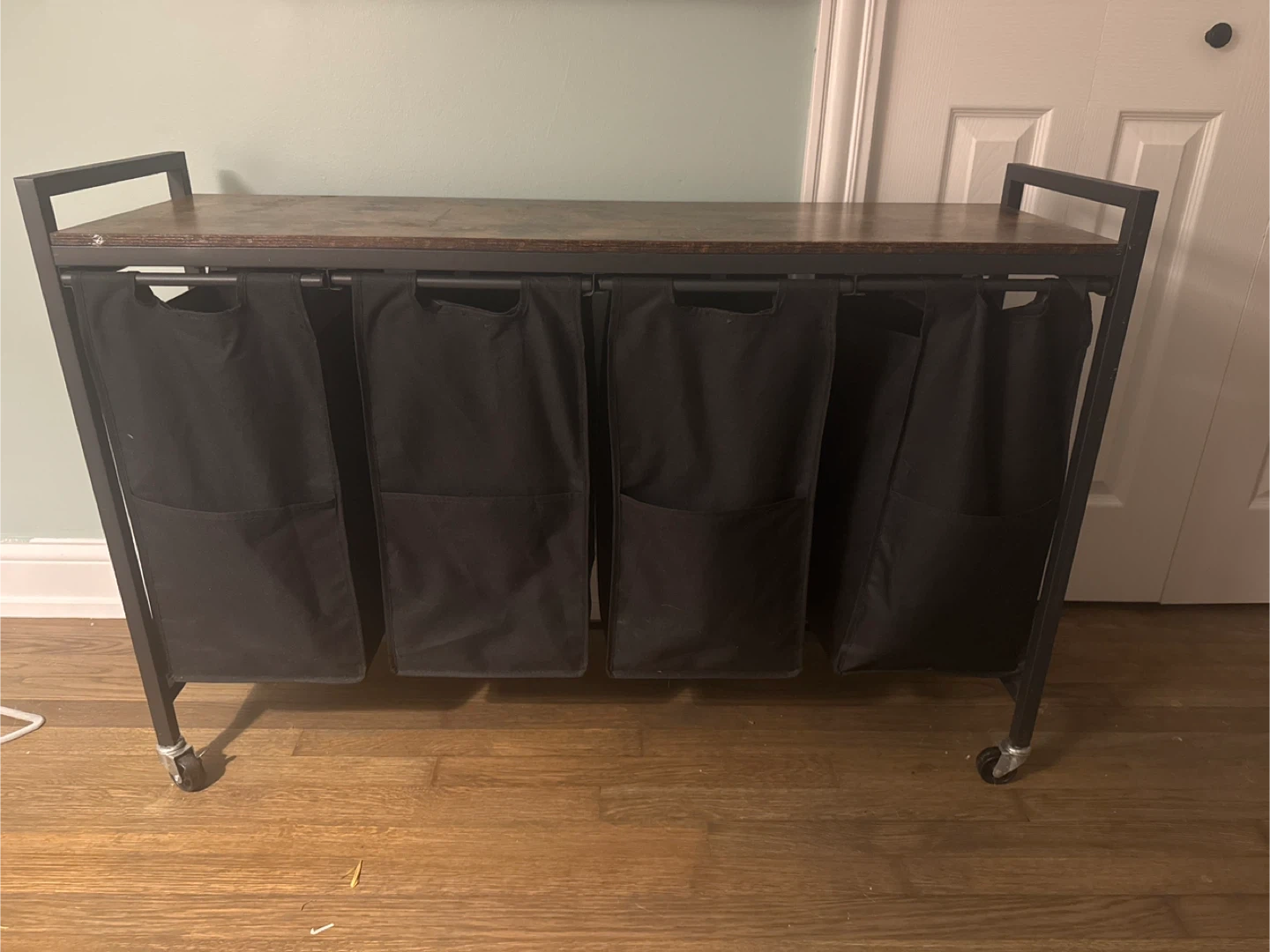 15This is a laundry sorter cart featuring four removable black bags. The cart has a wooden top and is on wheels, making it easy to move around. It's perfect for keeping your laundry organized!