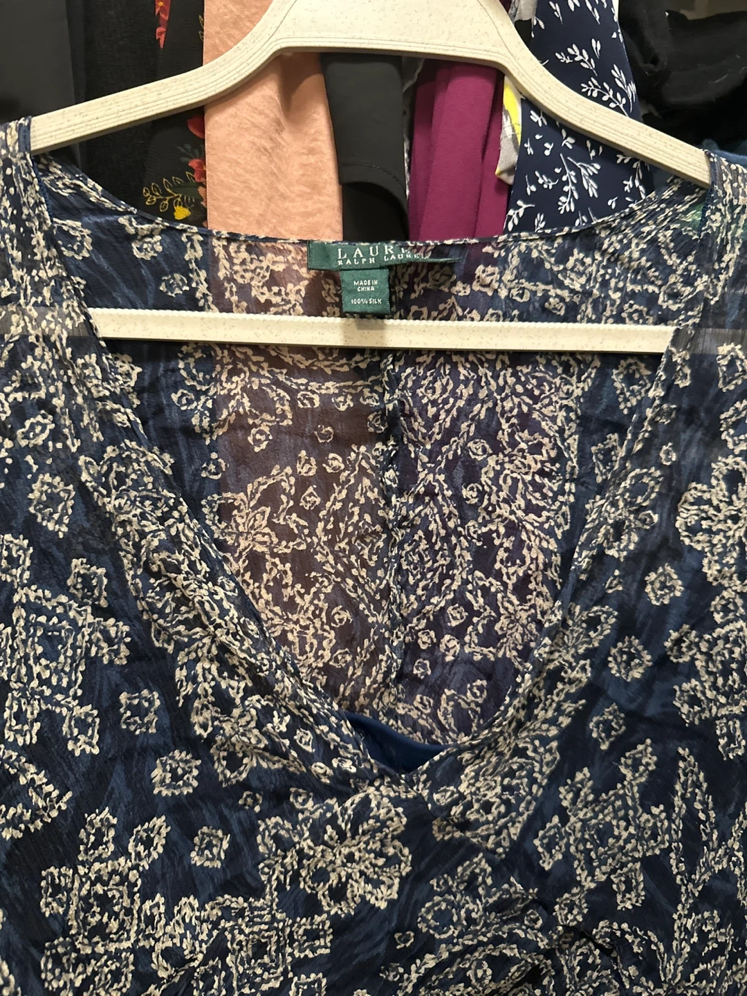 60This is a Lauren Ralph Lauren blouse in size 2X.It features a beautiful blue and white pattern. The material appears to be lightweight and flowy, perfect for warmer weather!