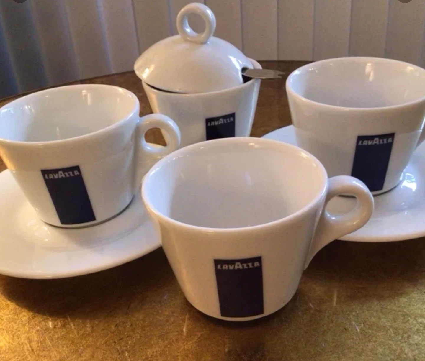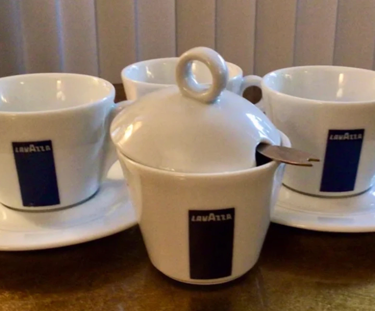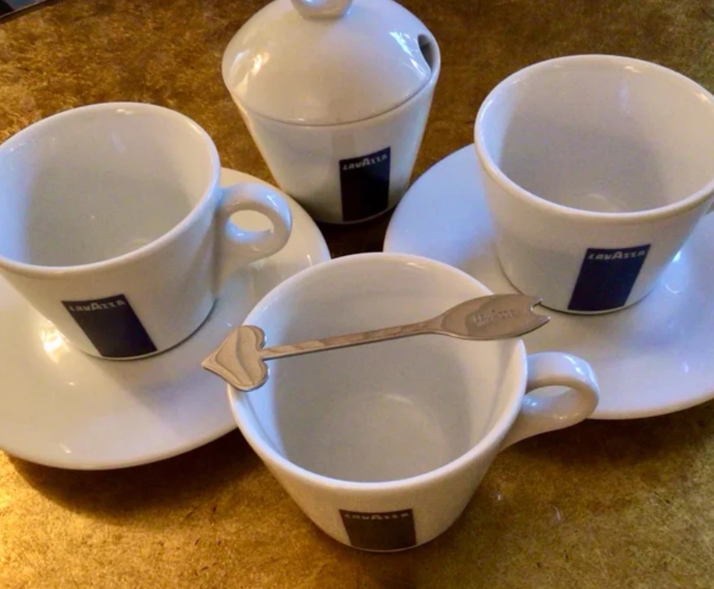 652 Sets of Lavazza Blue Ribbon Collection of Cups & Saucers + Sugar Bowl + Broggi Flatware and a spare cup! Elegant, sophisticated, so Italian!