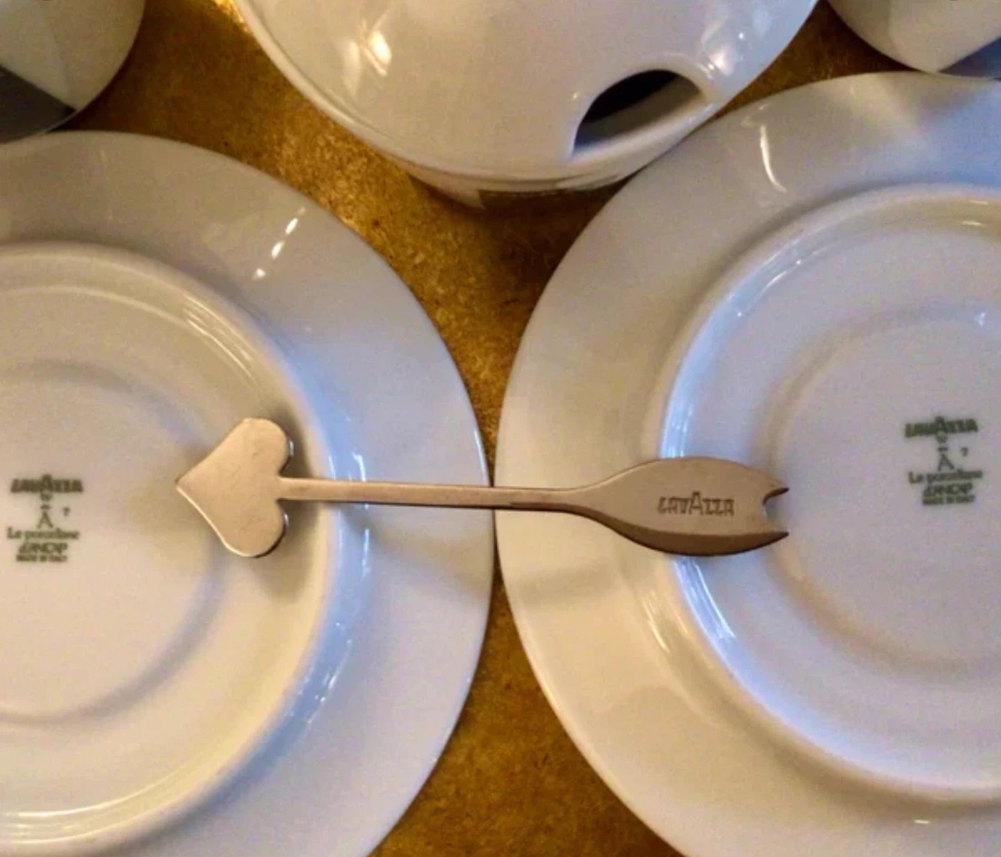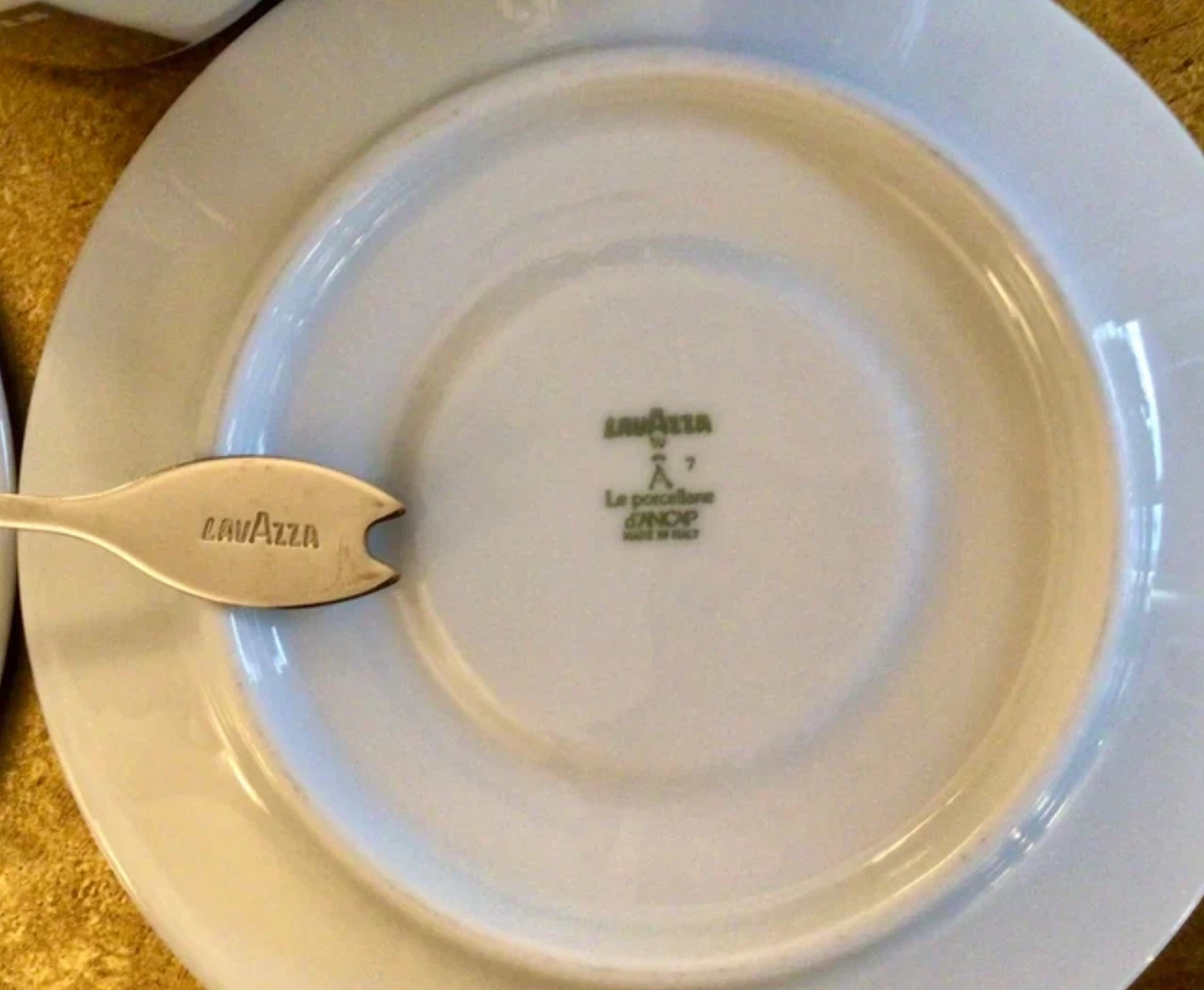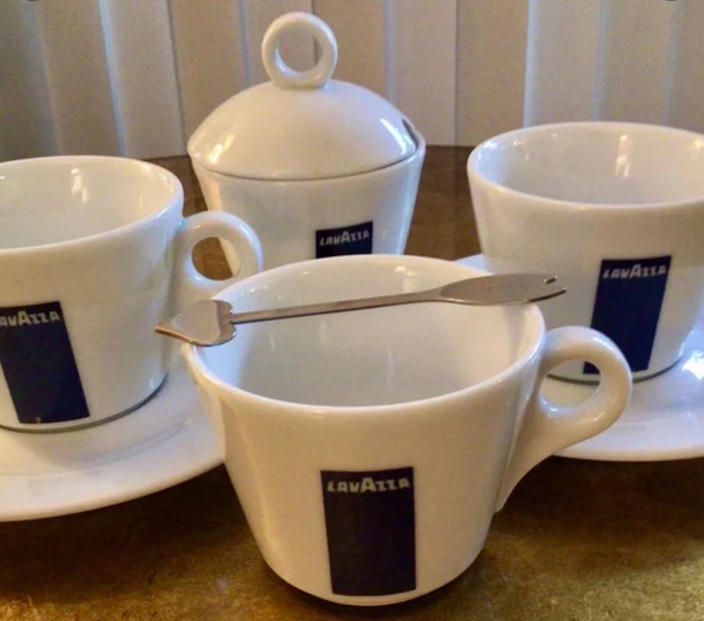 652 Sets of Lavazza Blue Ribbon Collection of Cups & Saucers + Sugar Bowl + Broggi Flatware and a spare cup! Elegant, sophisticated, so Italian!