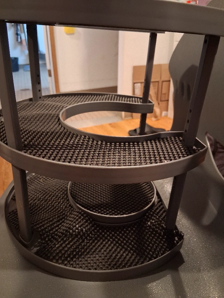 73This is a Lazy Susan turntable organizer, perfect for keeping things tidy! It has a three-tier design, providing ample space for storage. The organizer is gray and appears to be in good condition, ready to help you organize your space