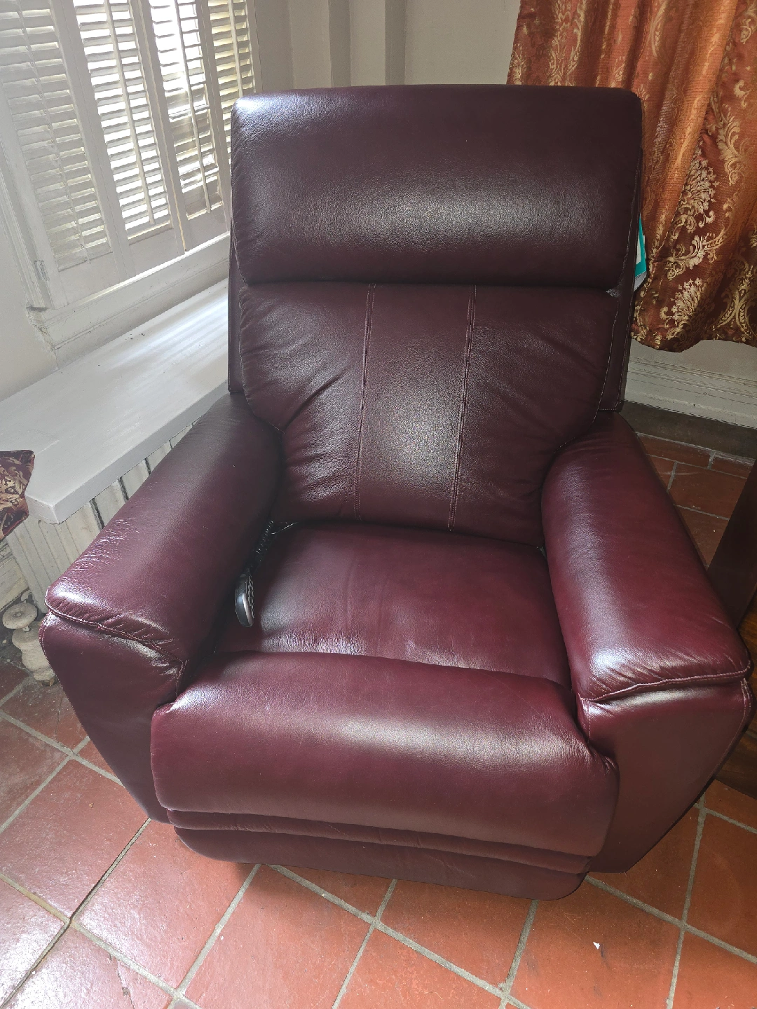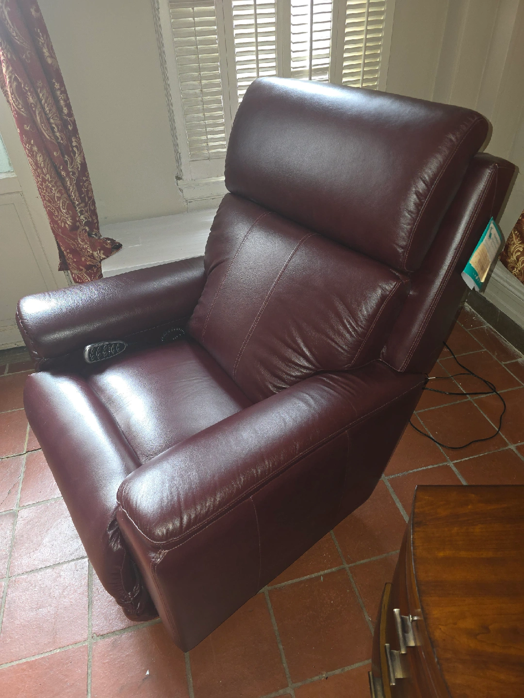 10Selling a comfortable burgundy leather recliner chair. It's in New condition and perfect for relaxing after a long day. The recliner mechanism works smoothly. Powered recliner never used! Purchased for over $2200