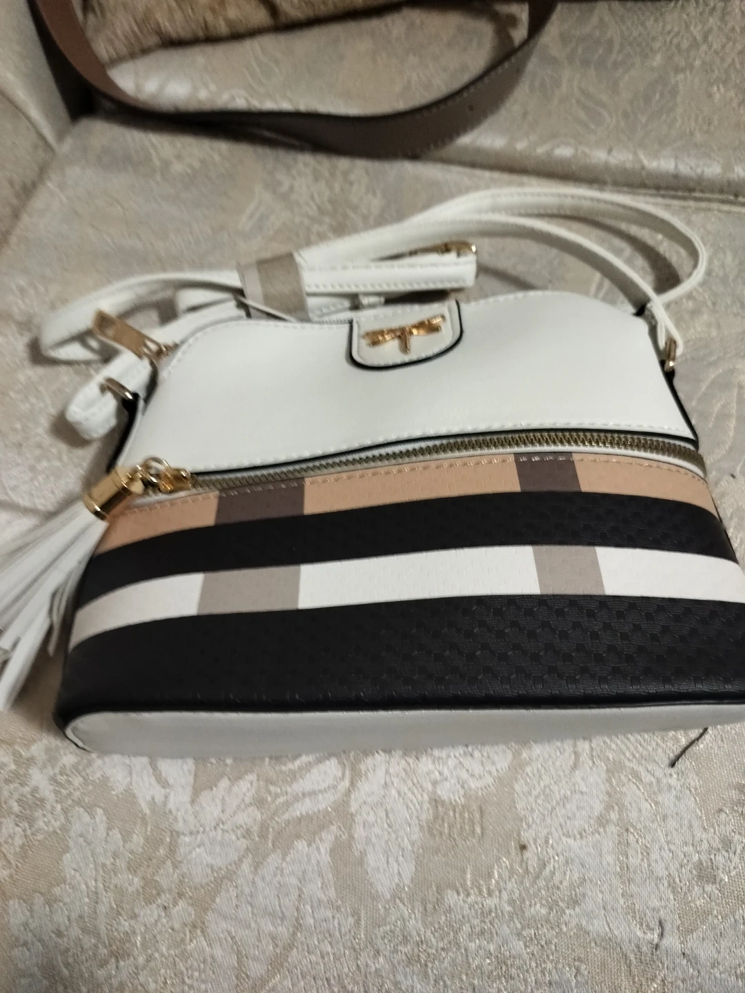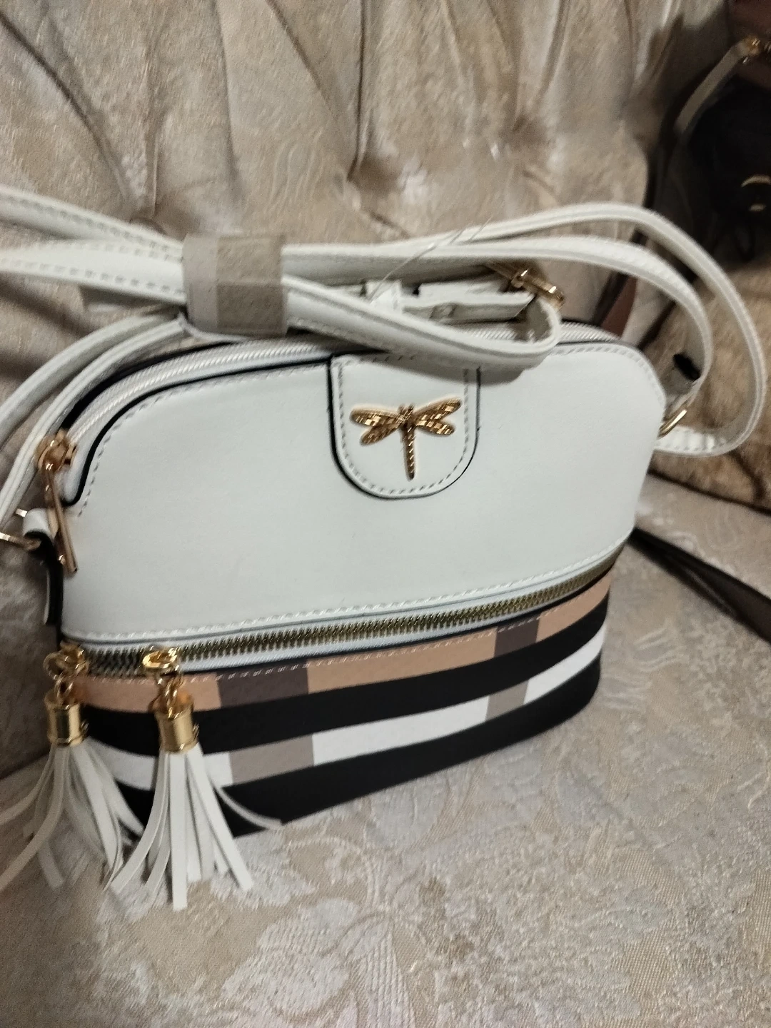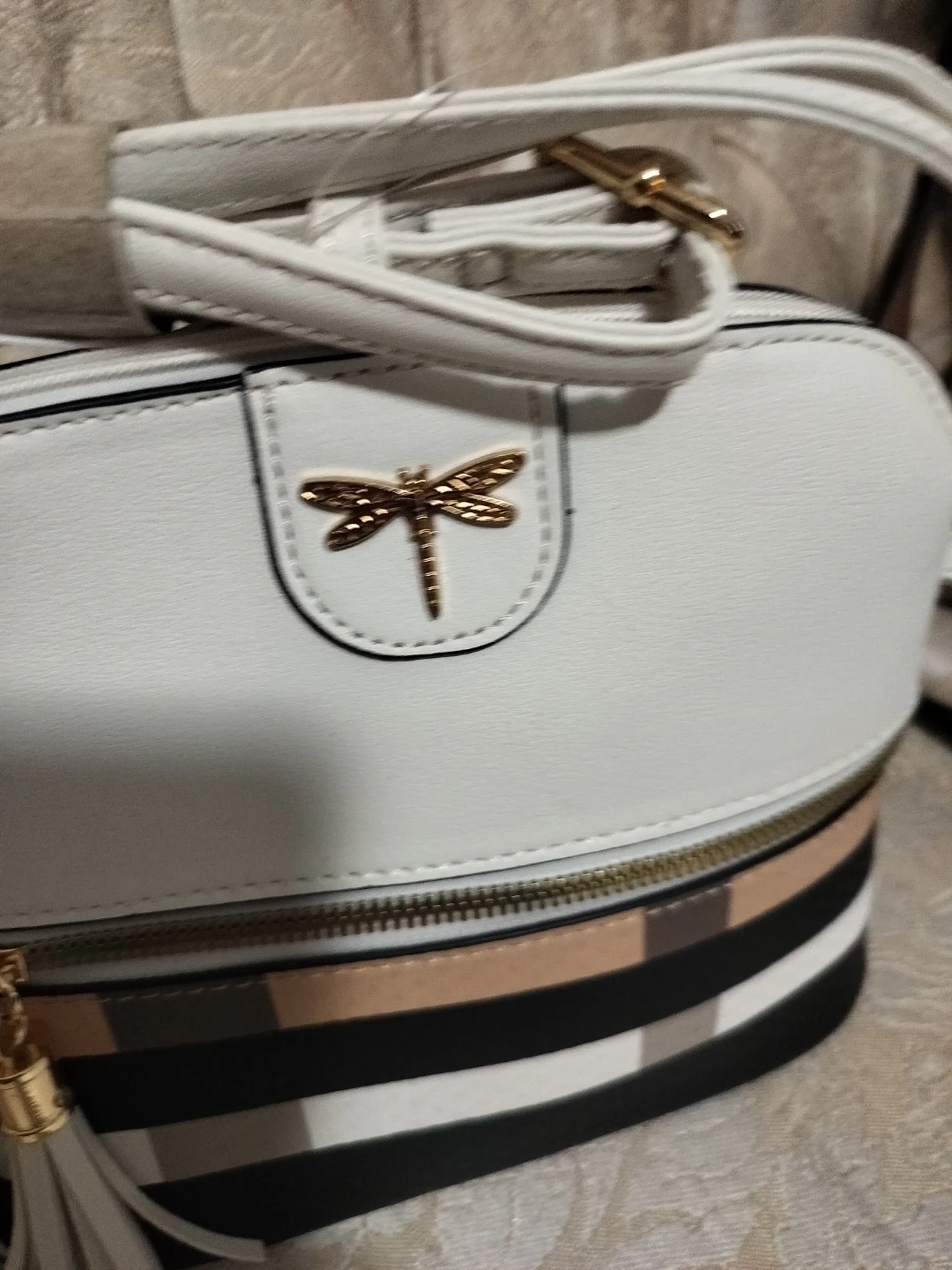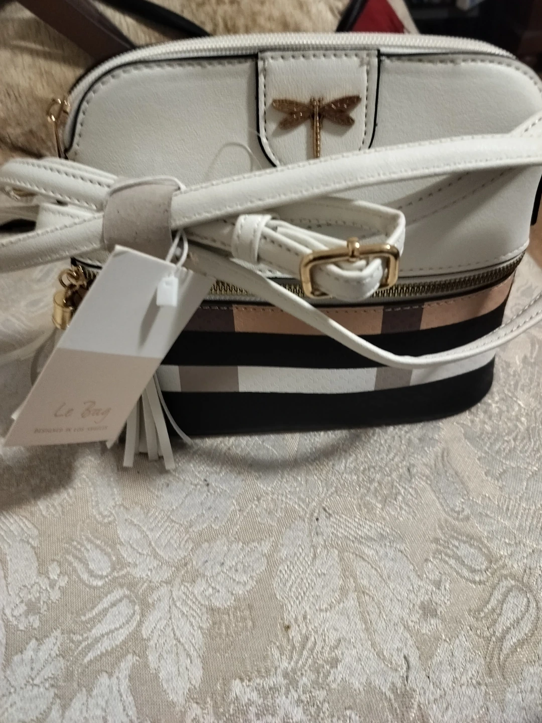 86This is a cute crossbody purse from Le Bag! It features a white top, striped bottom, and gold dragonfly detail. Perfect for adding a touch of style to any outfit!