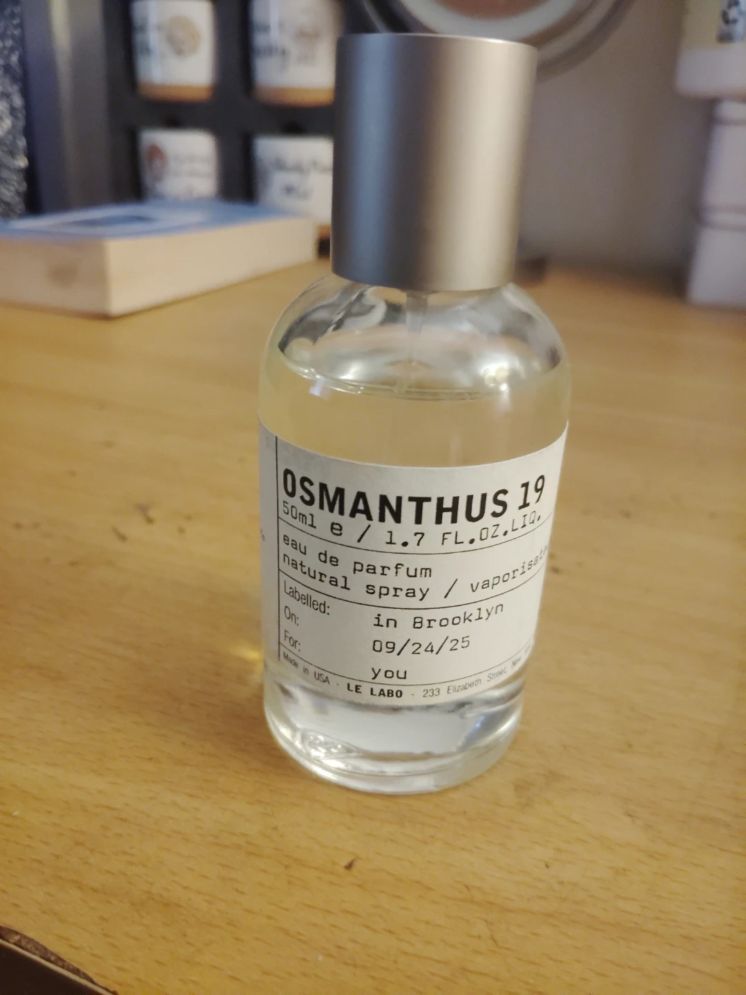 65Selling a bottle of Le Labo Osmanthus 19 Eau de Parfum. It's a natural spray in a 50ml bottle. This one is labelled in Brooklyn, with a date of 09/24/25. Made in the USA