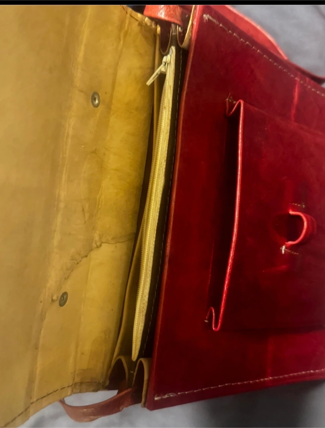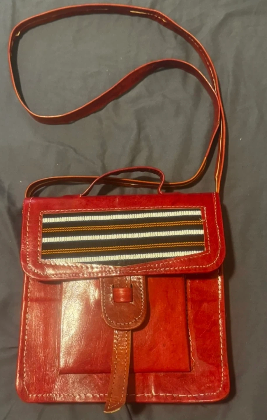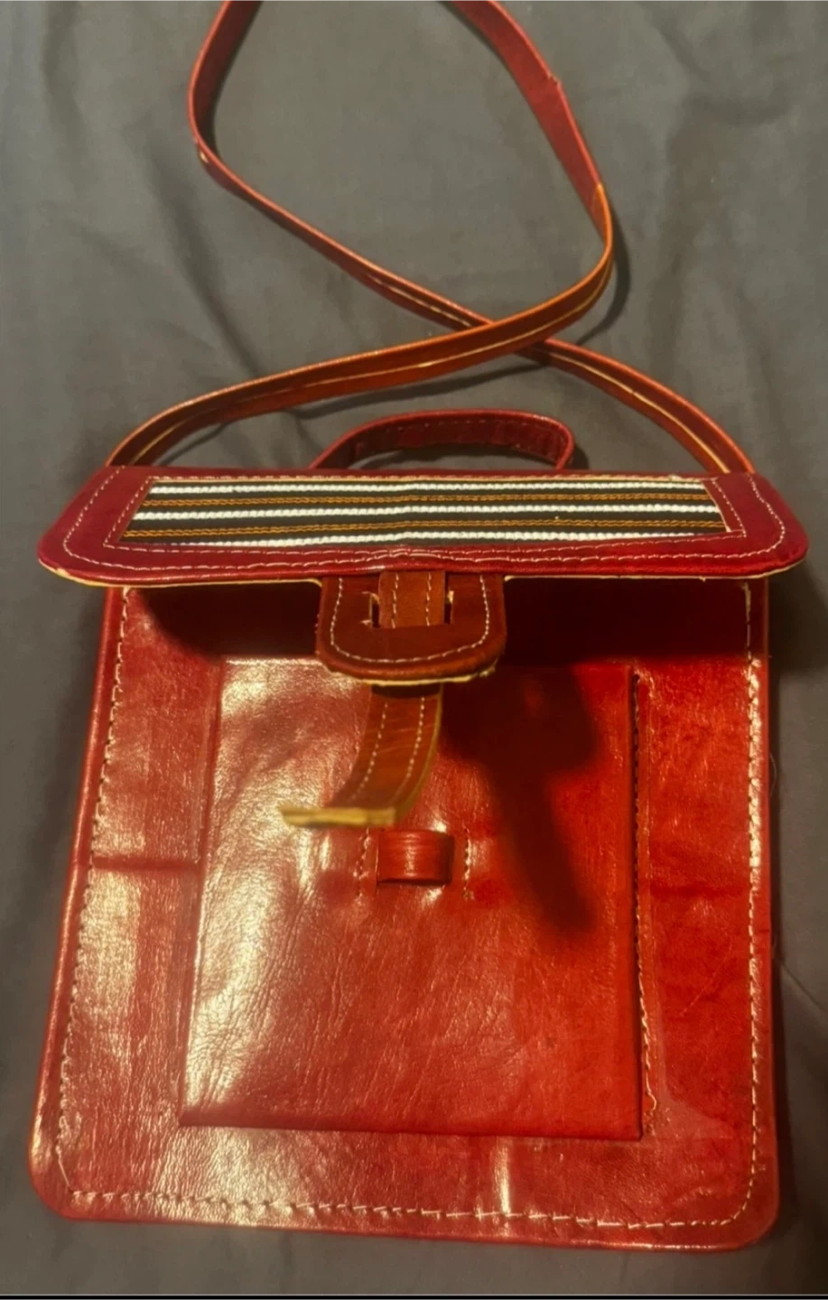 15Selling a cute handmade red leather crossbody bag from Africa! It features a unique design with a flap closure and a long strap for comfortable wear. The bag has a zippered compartment inside for organizing your essentials. Perfect for adding a pop of color to your outfit!