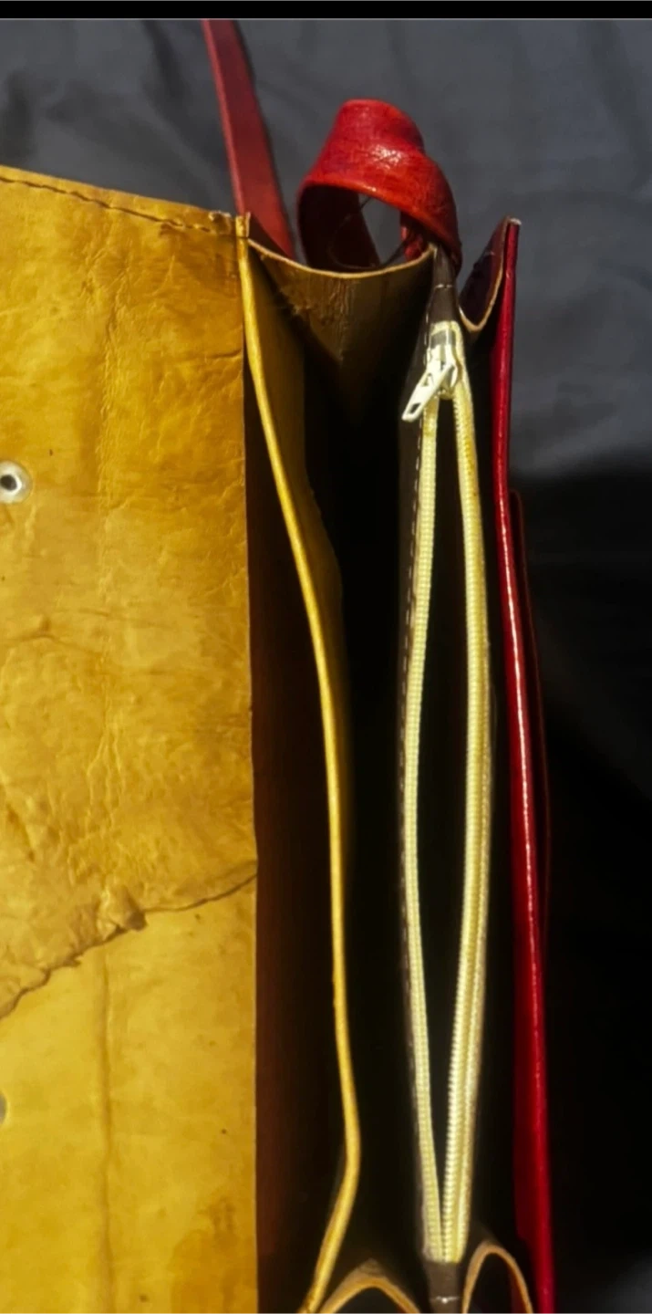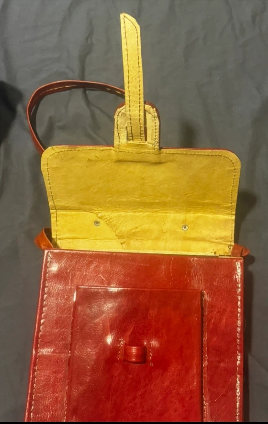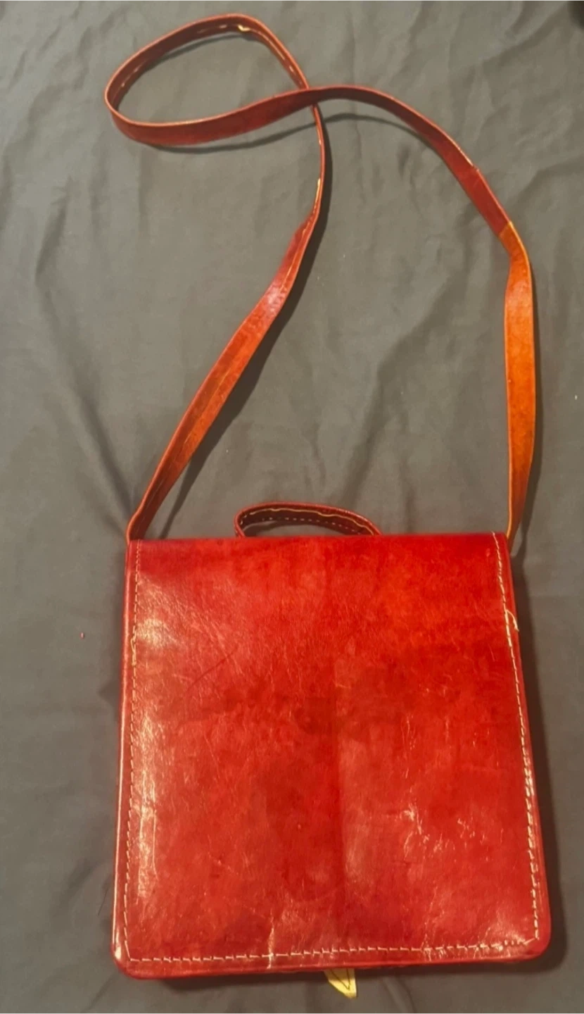15Selling a cute handmade red leather crossbody bag from Africa! It features a unique design with a flap closure and a long strap for comfortable wear. The bag has a zippered compartment inside for organizing your essentials. Perfect for adding a pop of color to your outfit!