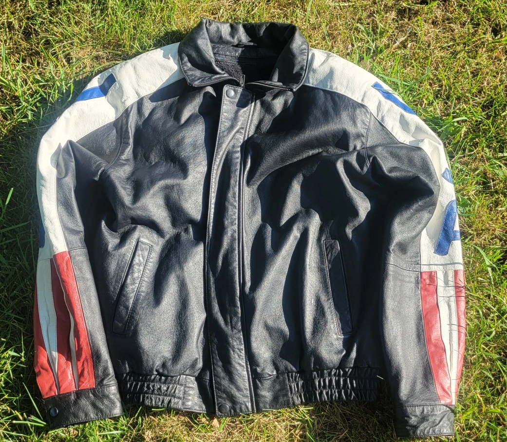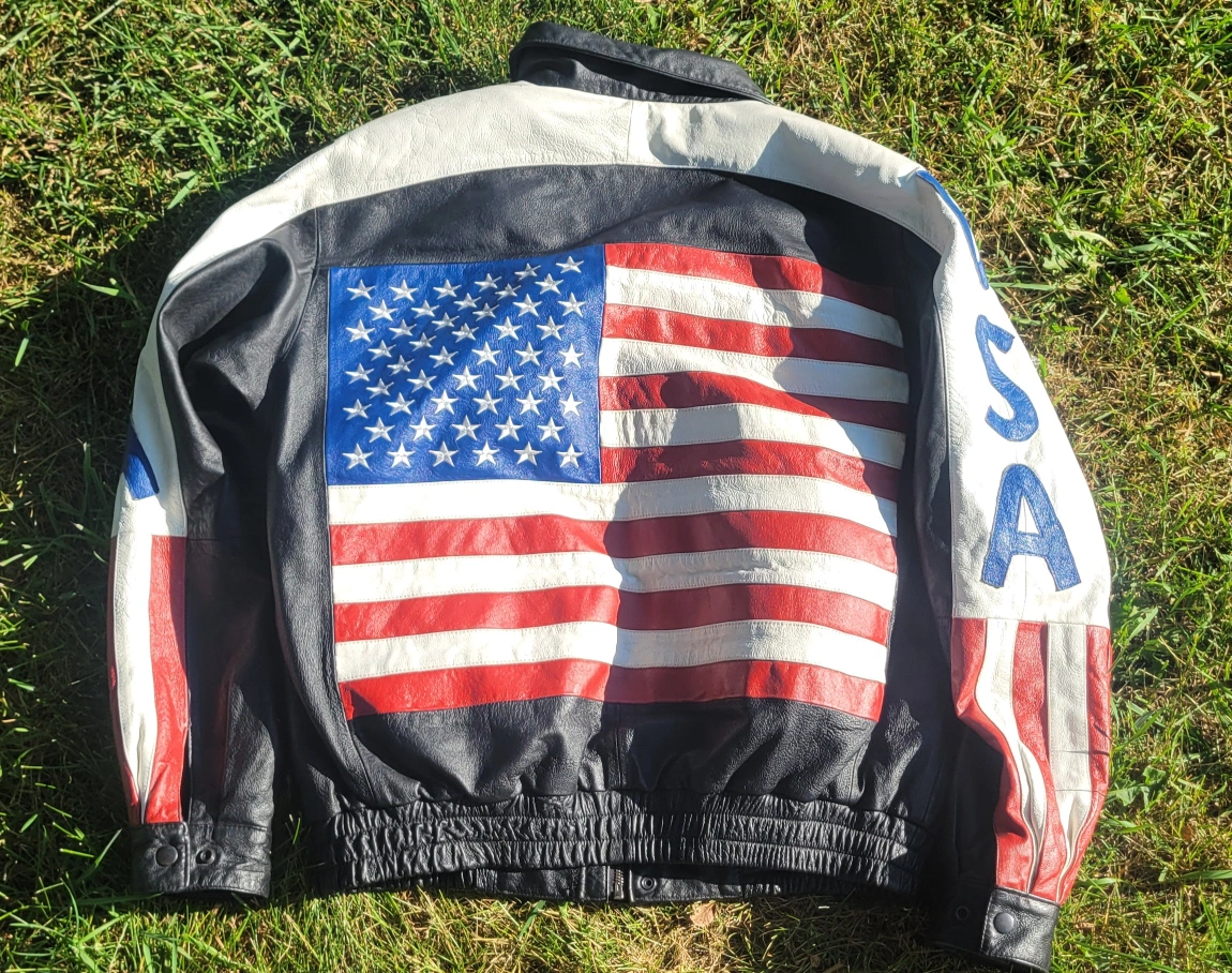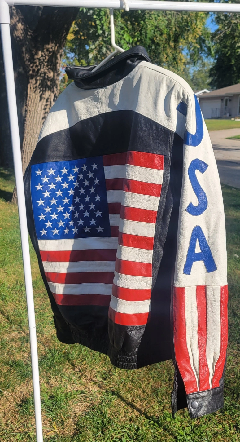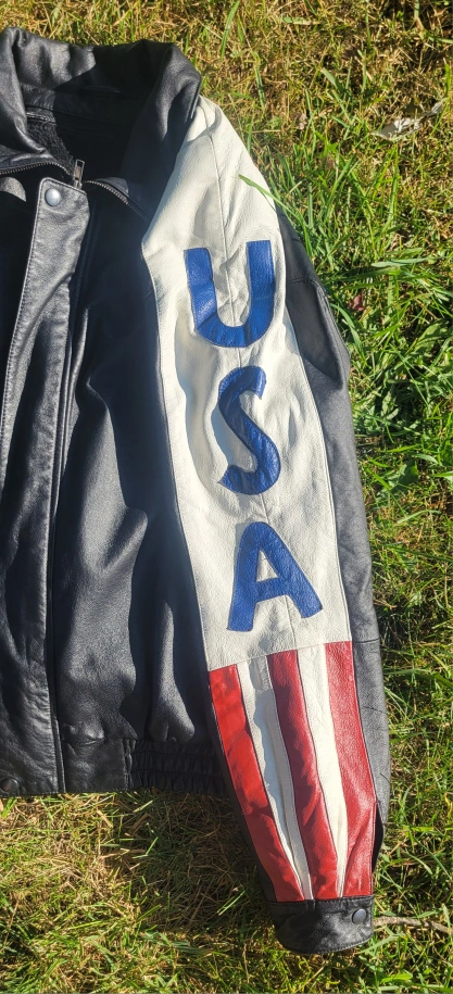 Leather jacket with a USA theme design. It has a black body with white shoulders and sleeves featuring 'USA' in blue lettering and red and white stripes. The back has a large American flag design. The inside is lined with a removable soft, black material. Gently worn Size Large I have 2 available. $60/Each or $100/Both