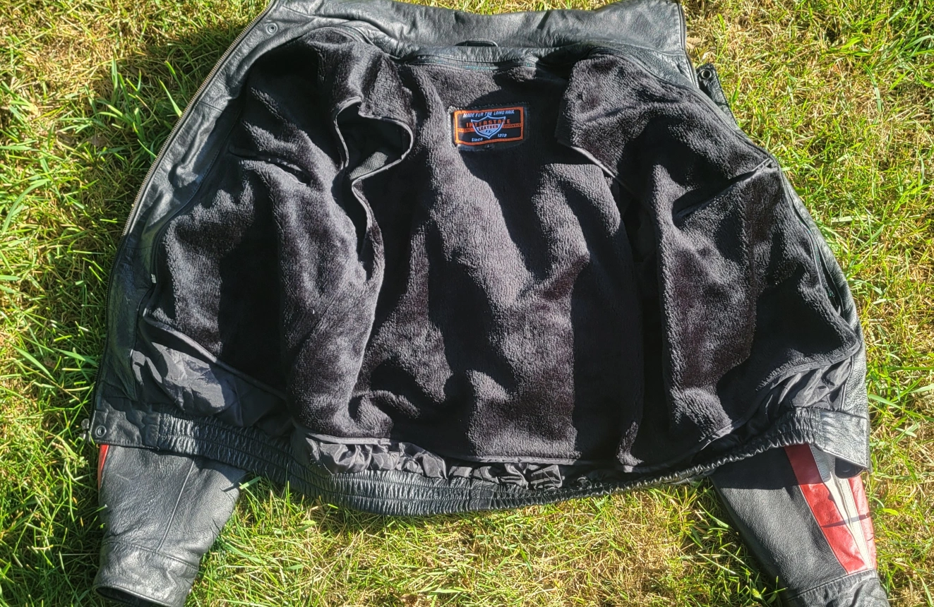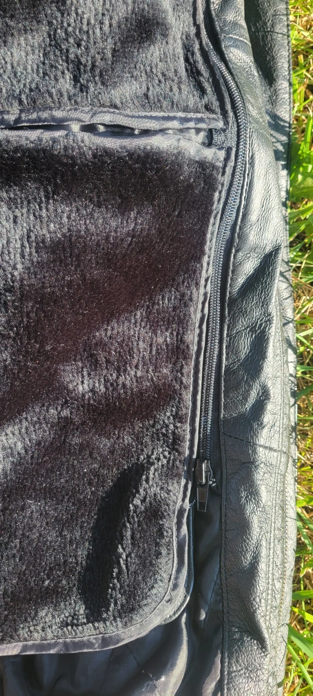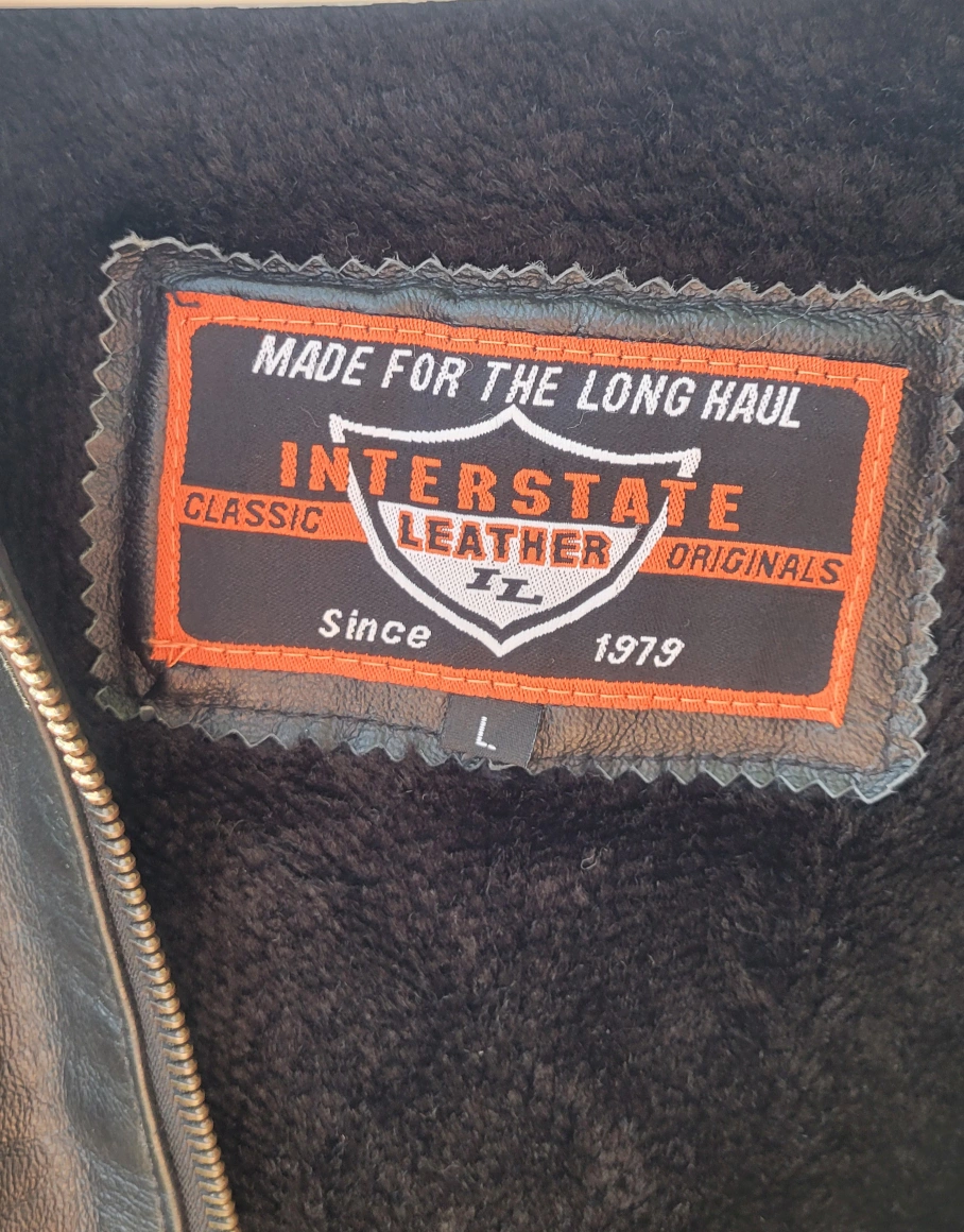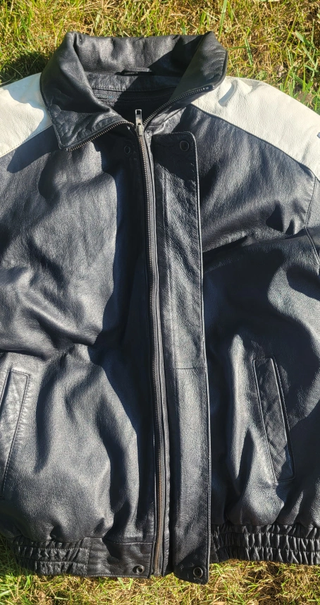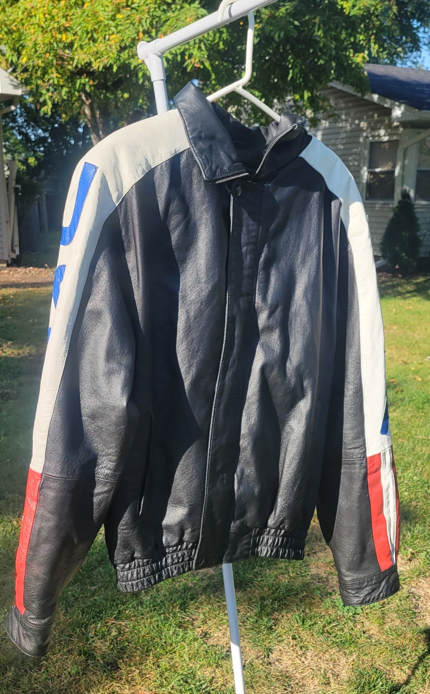 Leather jacket with a USA theme design. It has a black body with white shoulders and sleeves featuring 'USA' in blue lettering and red and white stripes. The back has a large American flag design. The inside is lined with a removable soft, black material. Gently worn Size Large I have 2 available. $60/Each or $100/Both
