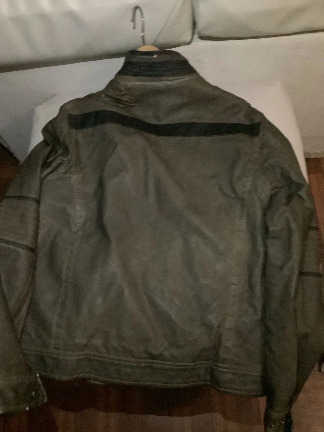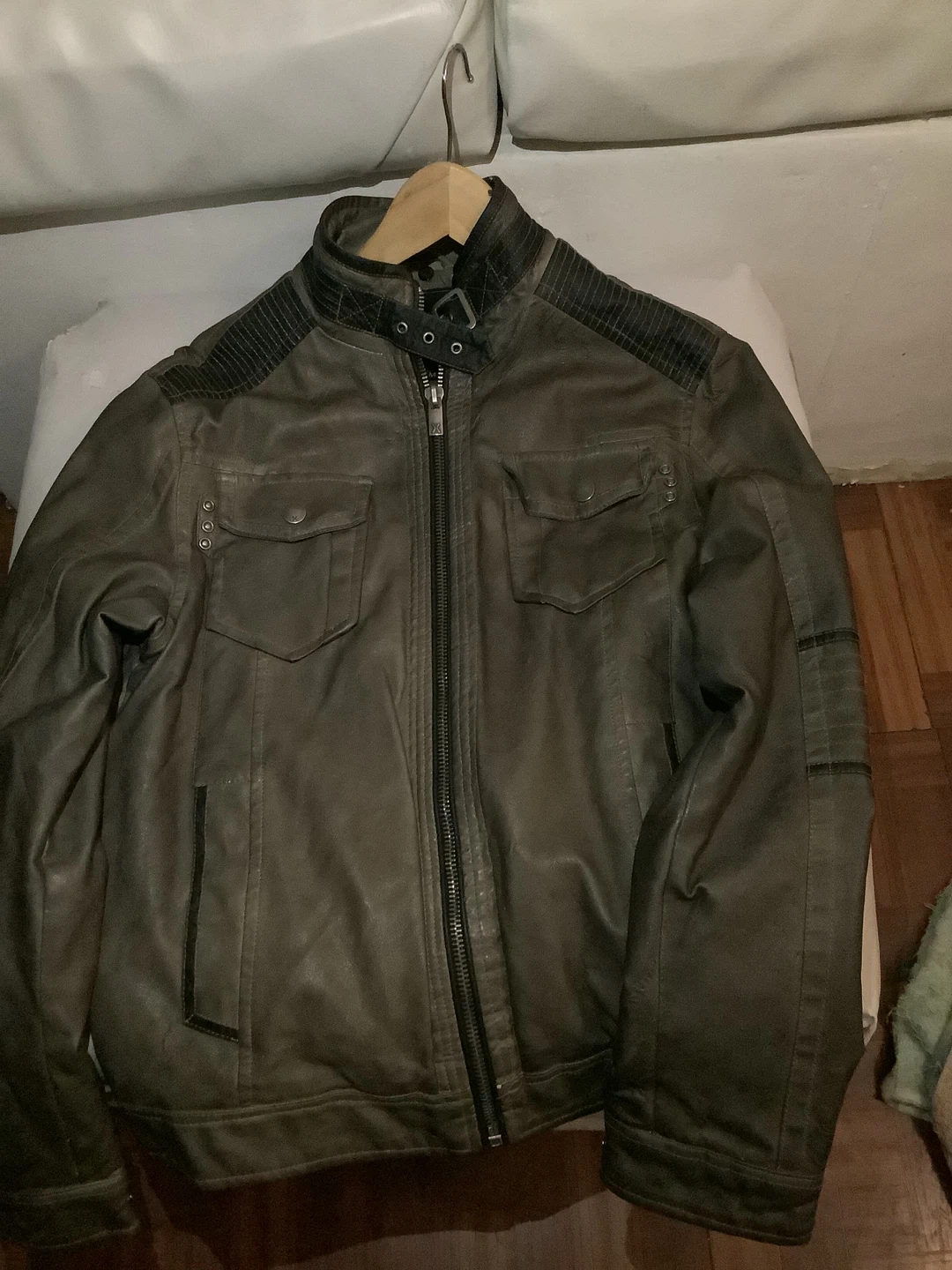 Selling a grey men’s medium leather jacket. It's a stylish and rugged jacket that's perfect for adding an edgy touch to your wardrobe. It appears to be in good condition and ready for a new owner!