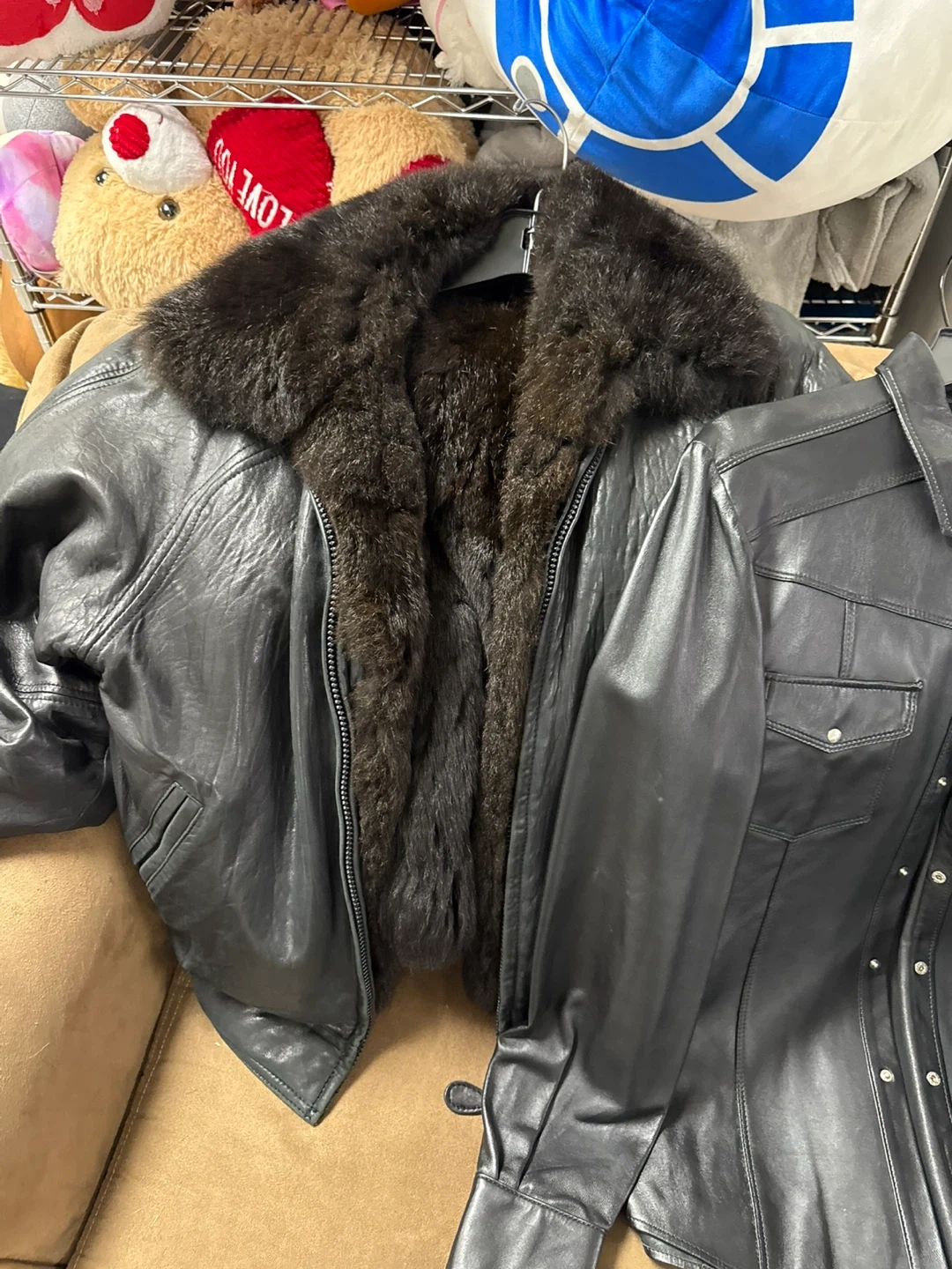 60Selling a stylish leather jacket featuring a fur collar. It's in great condition and ready for a new home! The jacket is black and made of leather.