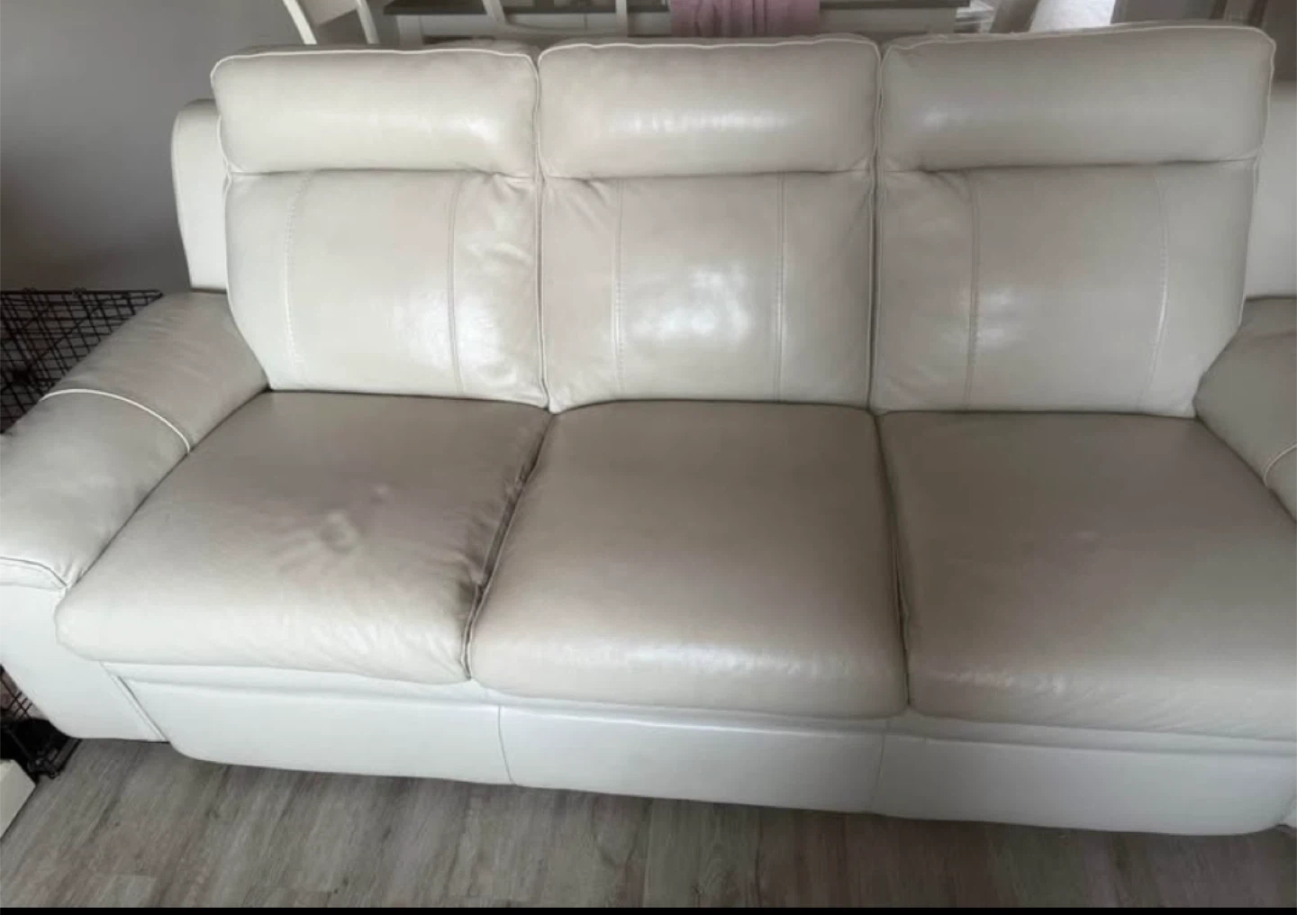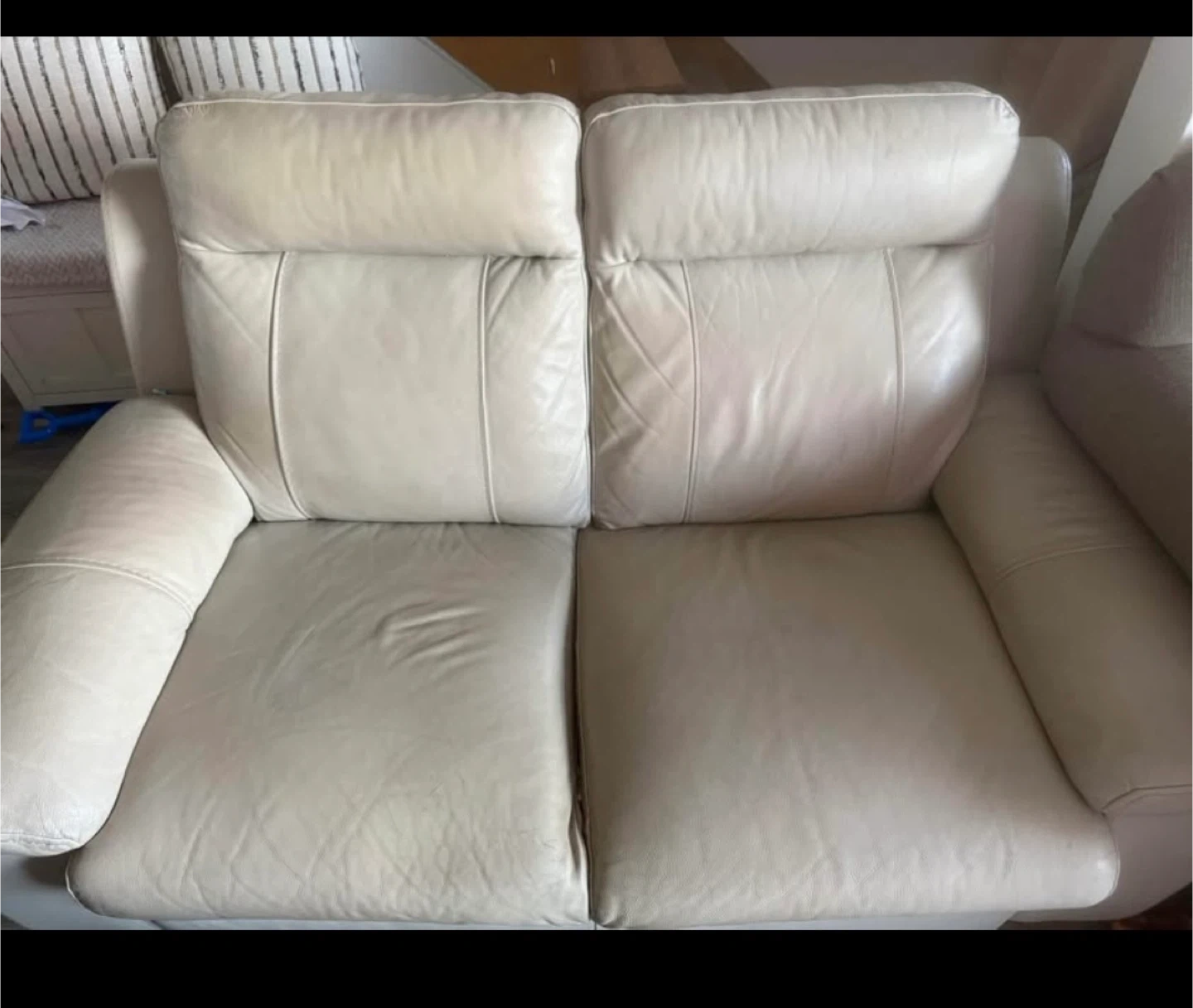 Selling a comfortable leather sofa and loveseat The sofas are in good condition they are not recliners and perfect for a living room or family room. The color is a neutral off-white, making it easy to match with any decor. Great for relaxing and entertaining guests!
