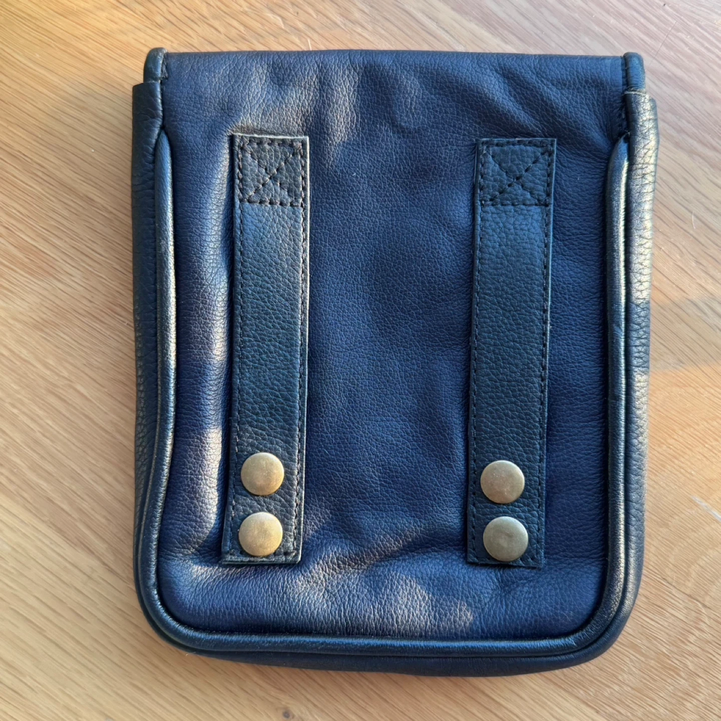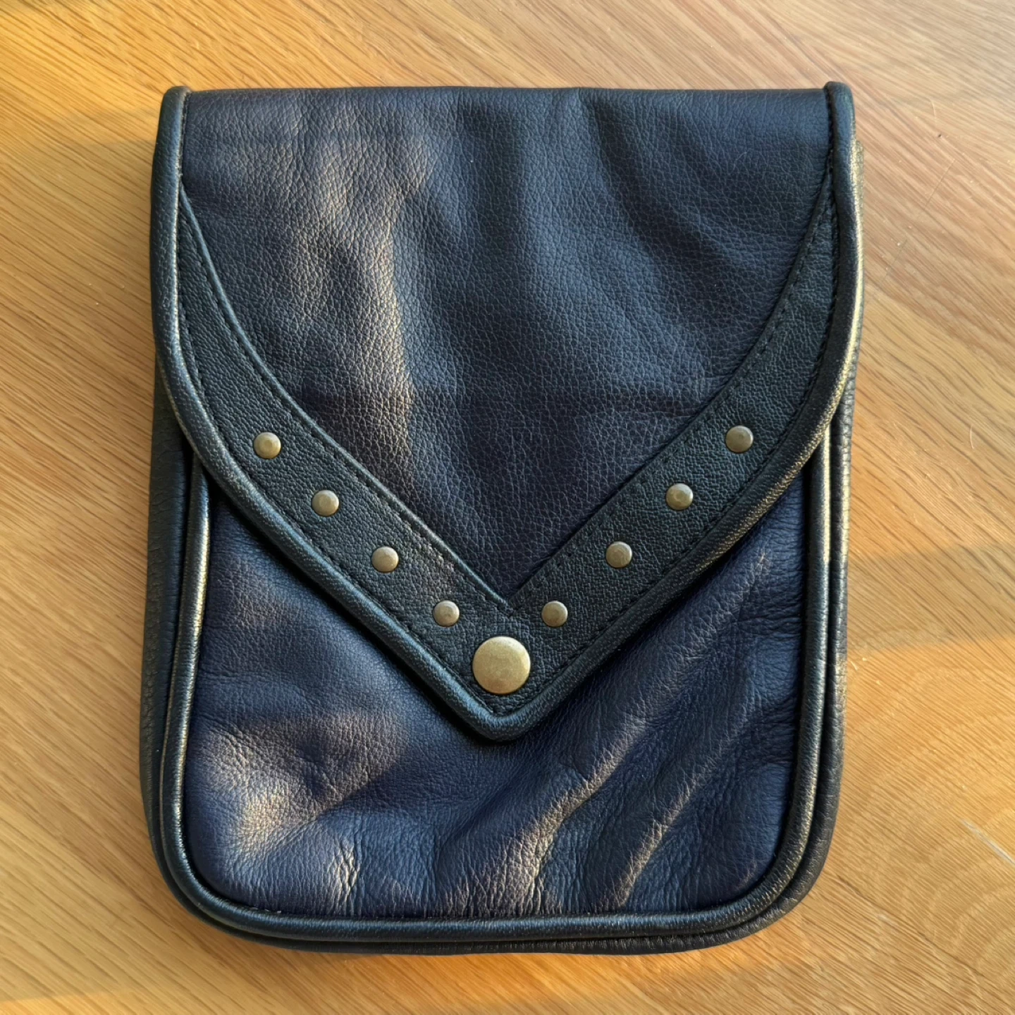 This is a stylish leather pouch bag in deep purple. It features a snap closure and a zippered inner pocket. It can be worn on a belt or crossbody with a strap.