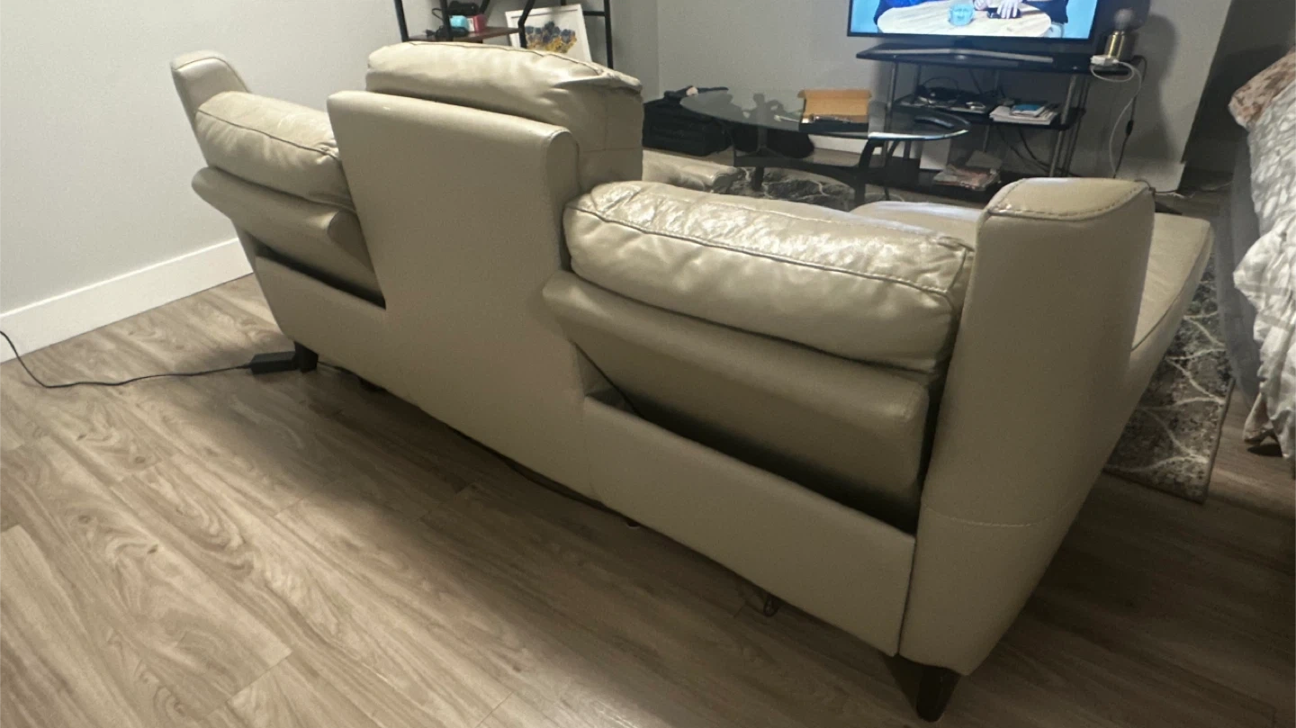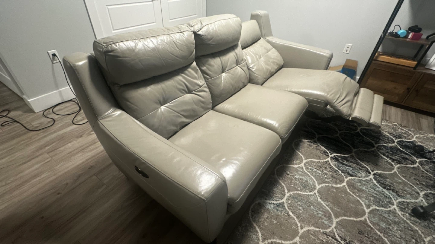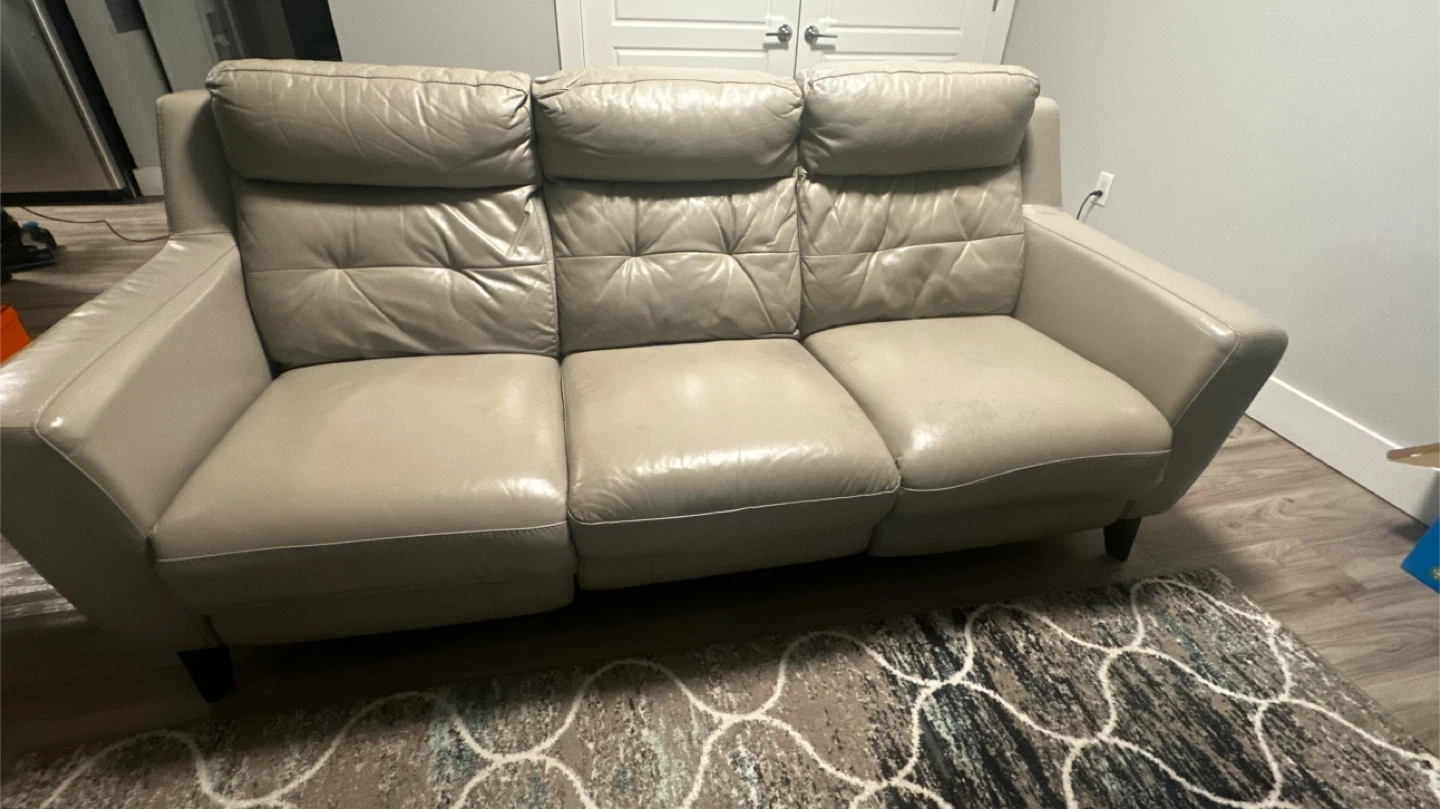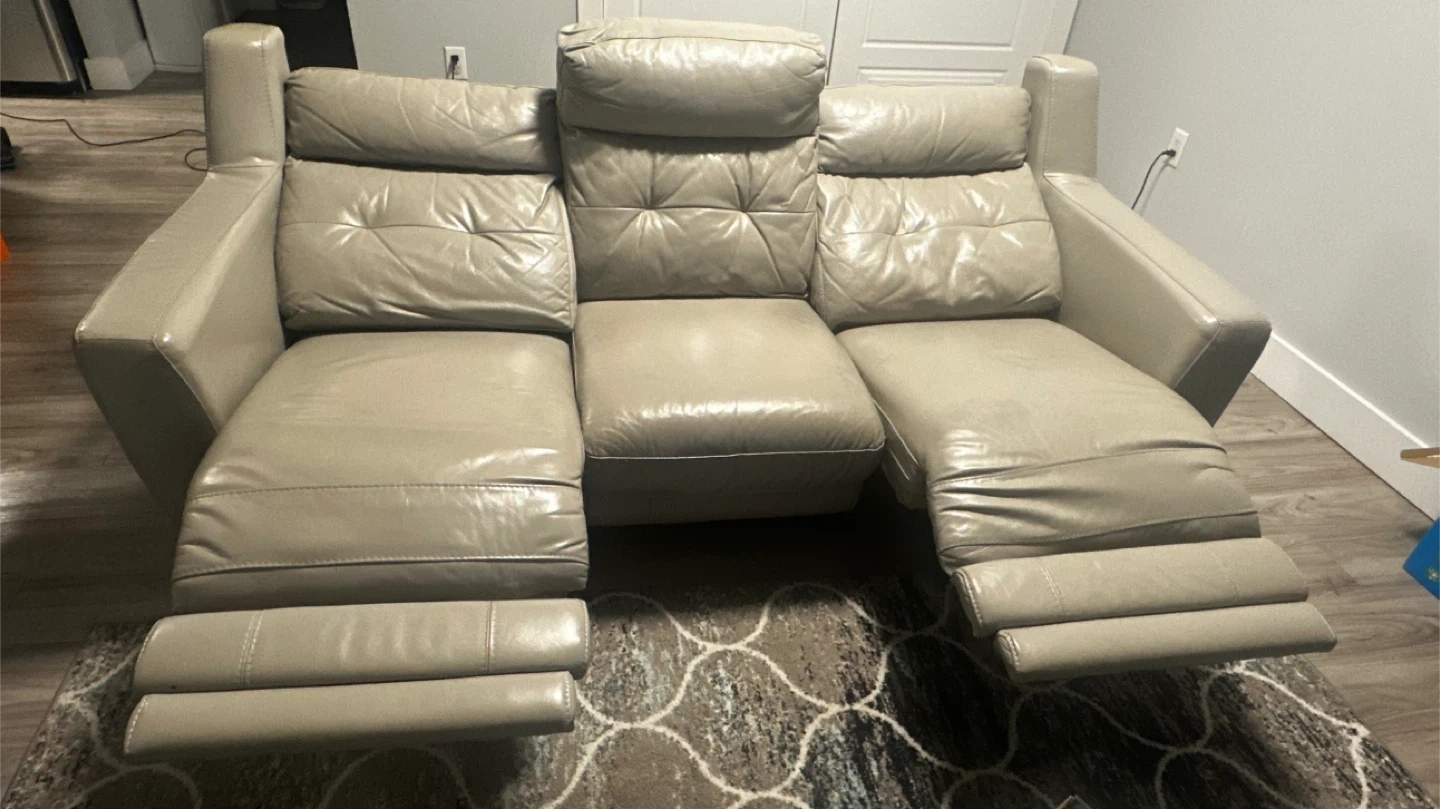Selling a comfortable leather reclining sofa. It's in good condition and perfect for relaxing after a long day. The sofa features reclining seats and a sleek design that will complement any living room decor