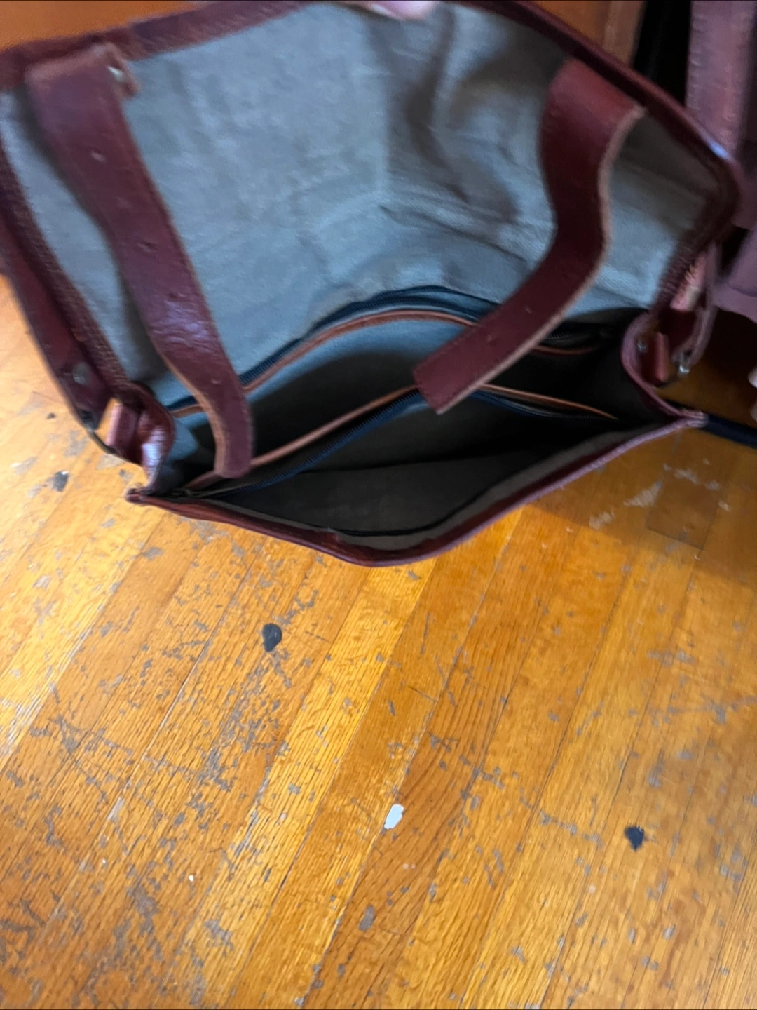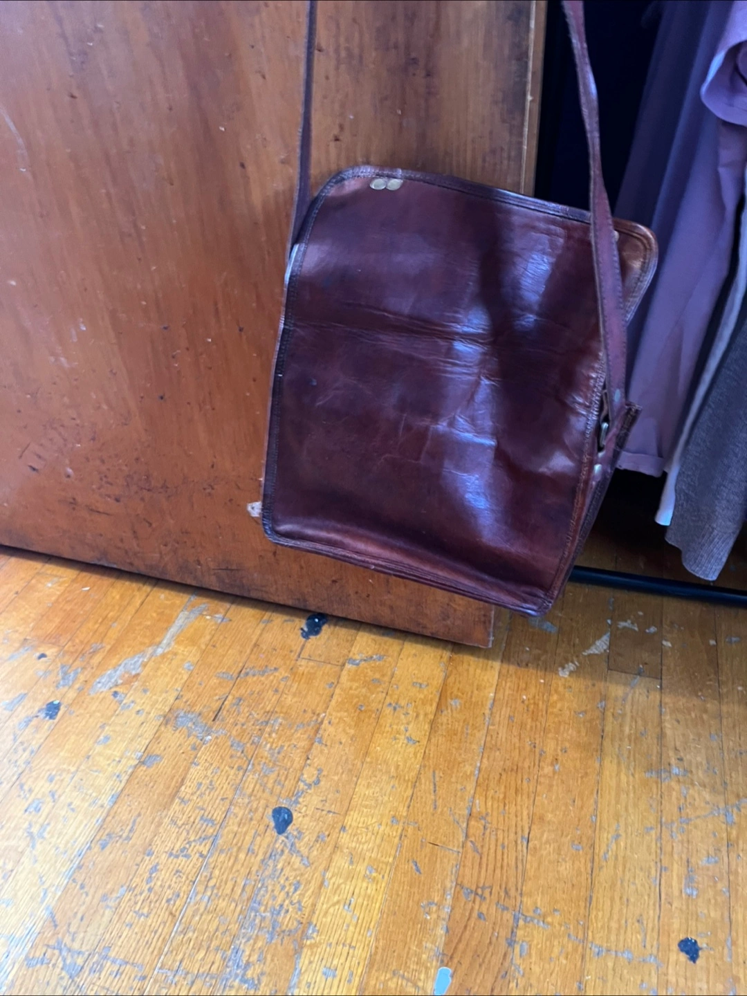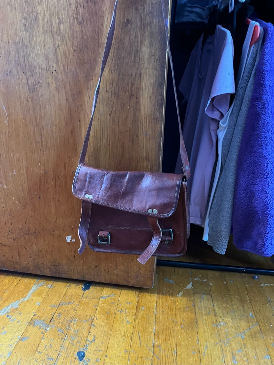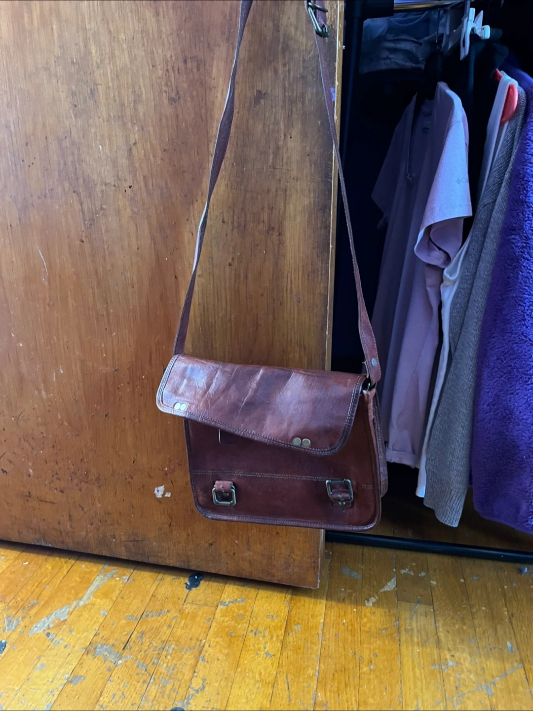 65Selling a leather satchel bag. It's a stylish bag with a shoulder strap and a flap closure. The bag shows some signs of wear but is still in good condition for daily use!