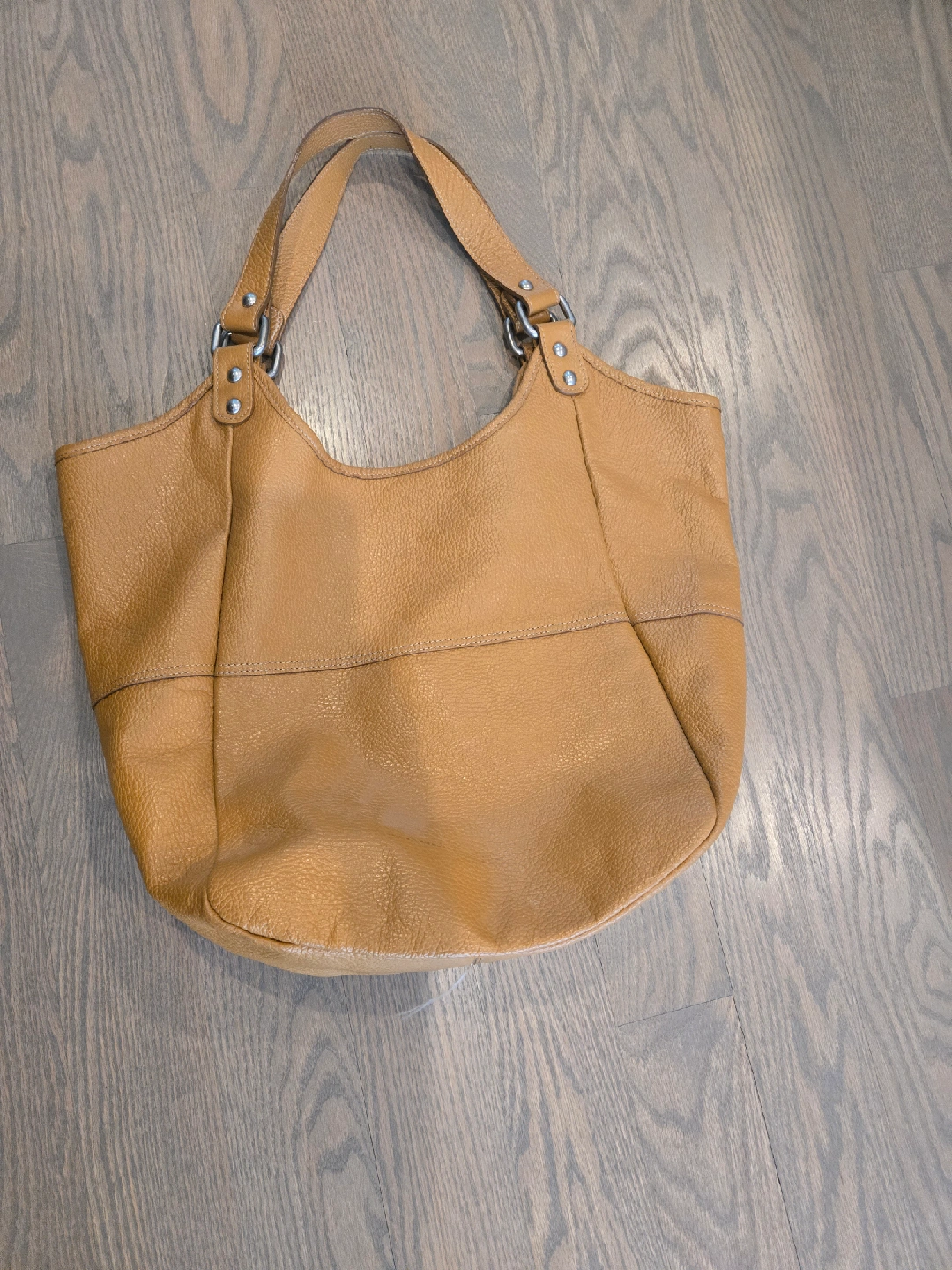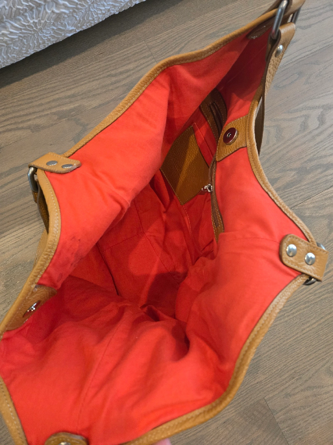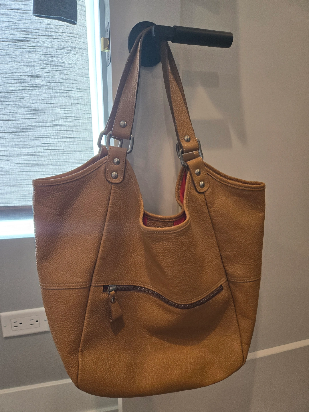 This is leather shoulder/tote bag in tan. It's in great condition and has a vibrant red interior. Perfect for everyday use!
