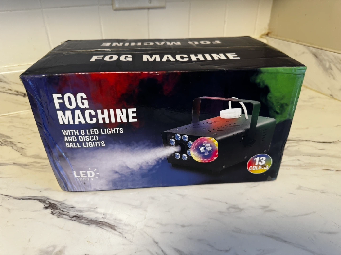 10I'm selling a fog machine with 8 LED lights and a disco ball. It's in great condition and comes with the original box. Perfect for parties or events!