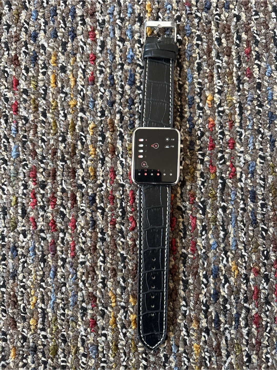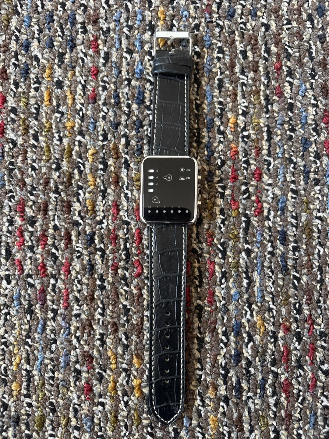 Selling a unique Binary watch which features a glass face with sleek, minimalist design with an LED display in Red & Yellow showing the time/date, AM/PM. The band has a stylish, textured pattern. It's in great condition and ready for a new wrist! Local pick up Only !!!