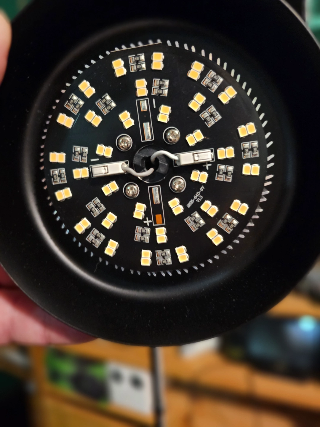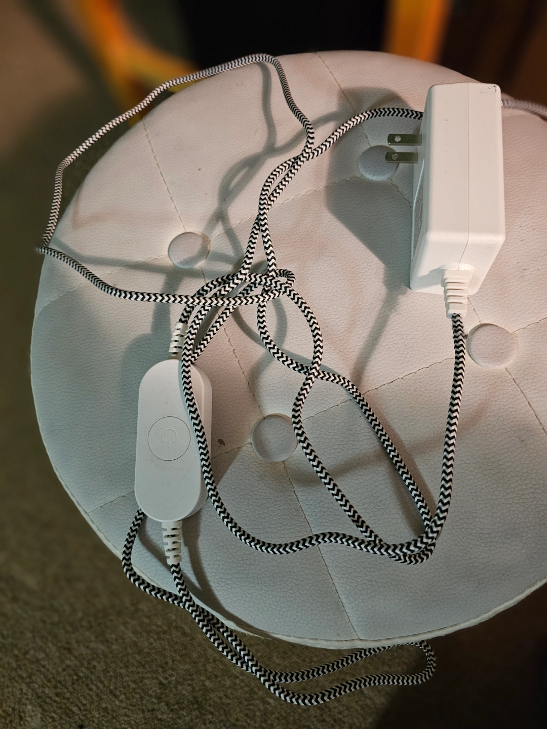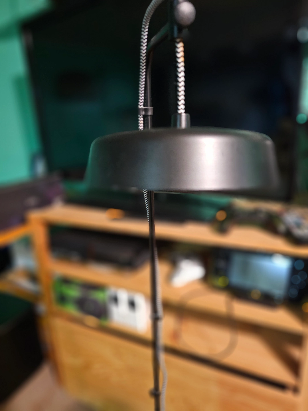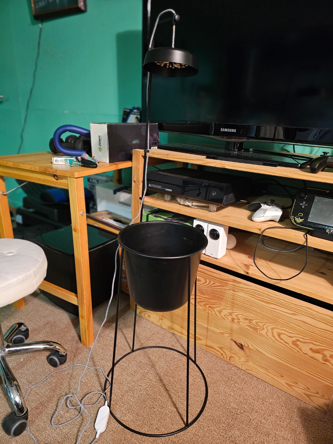 Black LED desk lamp with adjustable gooseneck. Features a unique plant pot stand. Includes power adapter and inline switch. Modern design. Good lighting.