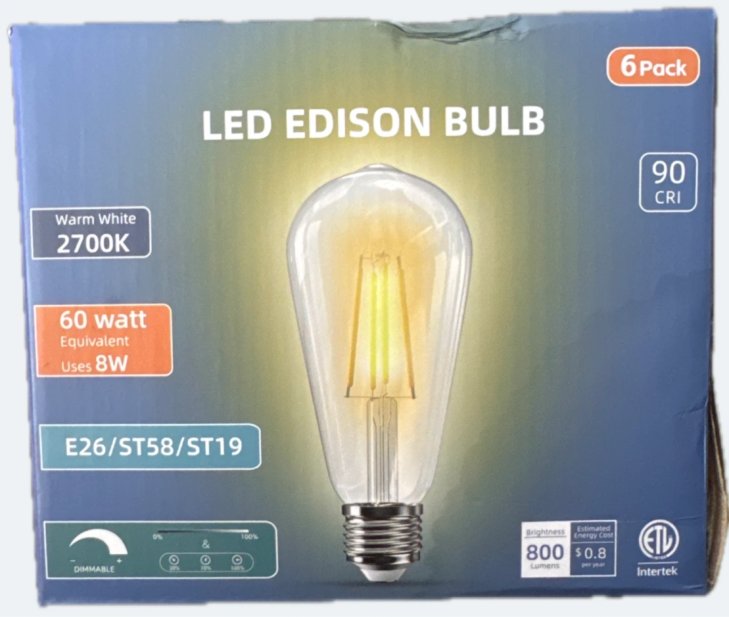 83Selling a 6-pack of LED Edison bulbs. They emit a warm white light at 2700K. Each bulb is a 60-watt equivalent but only uses 8W. These bulbs are dimmable and have a brightness of 800 lumens. They also have a 90 CRI