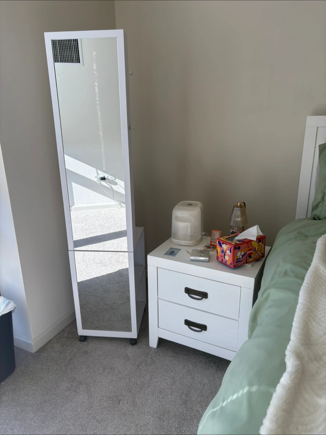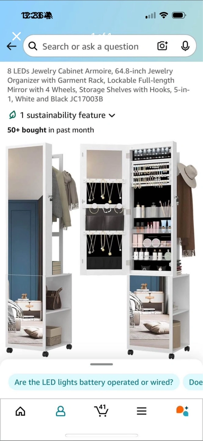10Selling a jewelry cabinet armoire with a full-length mirror! It features 8 LEDs to help you see all your jewelry. It also includes a garment rack, lock, and storage shelves with hooks. It has 4 wheels for easy moving, and is 5-in-1, white and black.