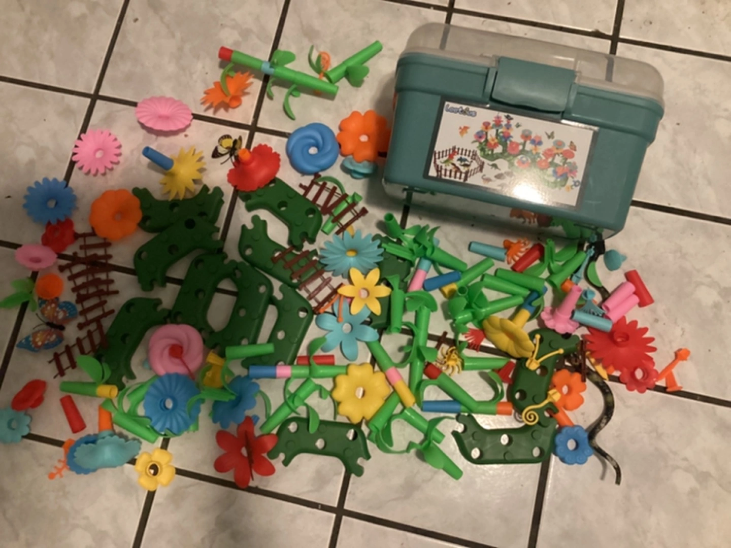 Colorful plastic building blocks. Garden theme. Includes various flowers, plants, fences, and other accessories. Comes in a teal plastic carrying case. Great for imaginative play.