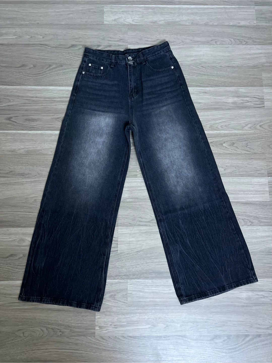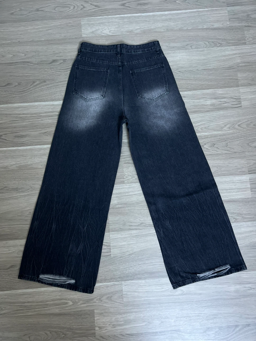 I'm selling wide-leg jeans in size M. They're stylish, dark wash, and comfortable. Look at the photos for the distressed detail at the bottom of the legs. Also, look at the photo showing the size specifications.