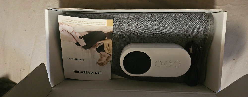Selling a leg massager that's in great condition! It features warm hot compress, airbag massage, built-in battery, a variety of patterns, and a key control. It also includes the instructions and box