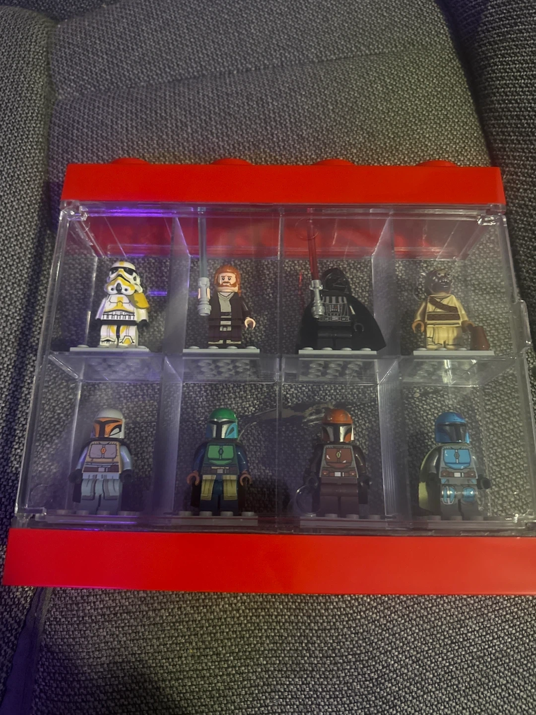 15Selling a collection of LEGO Star Wars minifigures displayed in a red-trimmed case. Includes iconic characters like a Stormtrooper, Obi-Wan Kenobi, Darth Vader, and several Mandalorian figures. Great for any Star Wars or LEGO enthusiast!