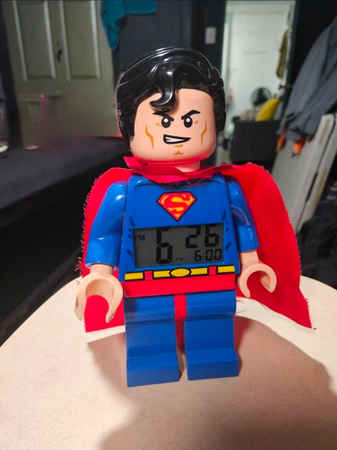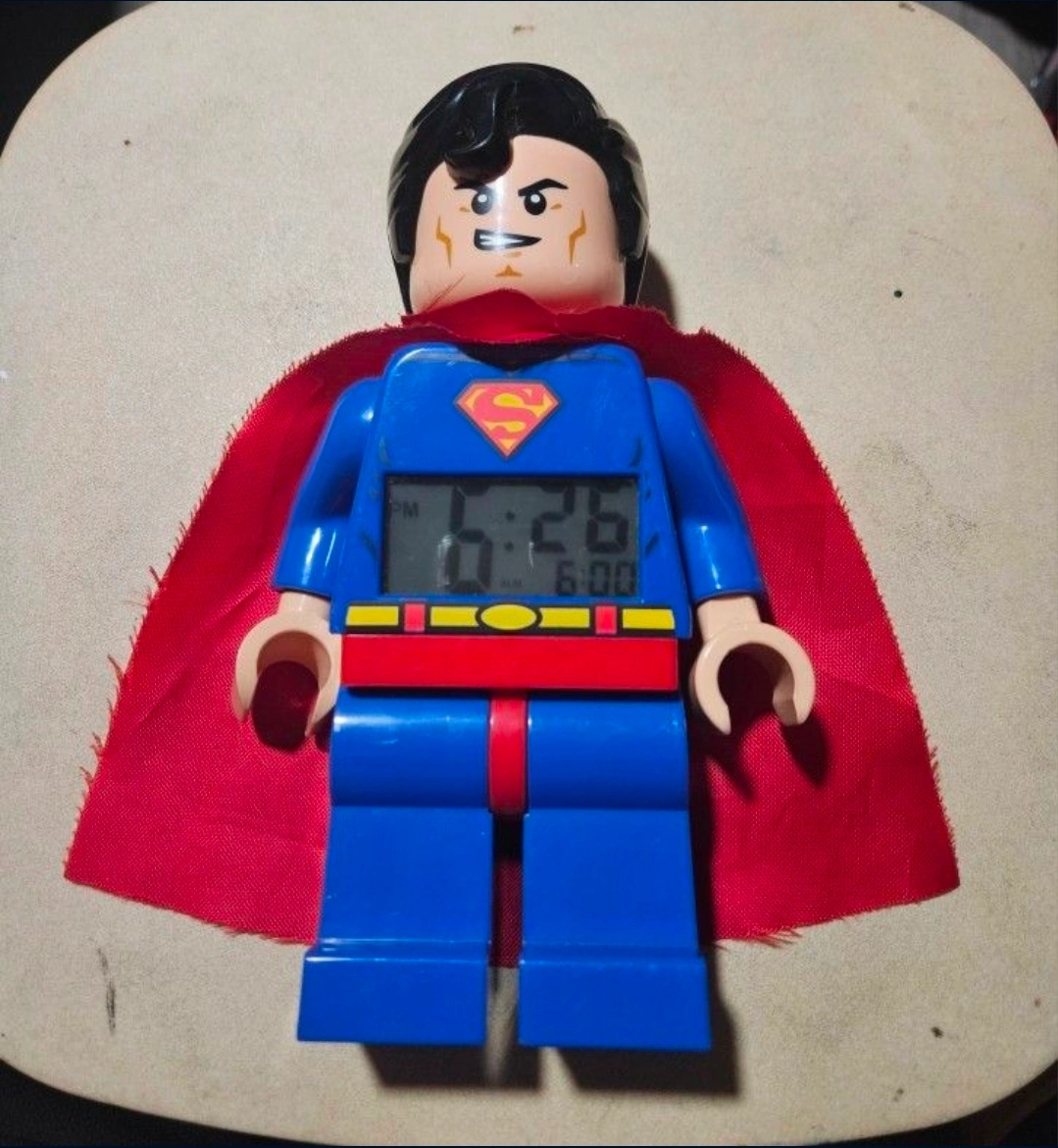 10Item is used LEGO DC Super Heroes Superman minifigure alarm clock. Digital LCD. 9.5 inches tall. Moveable arms and legs. Alarm and snooze functions. Light up display