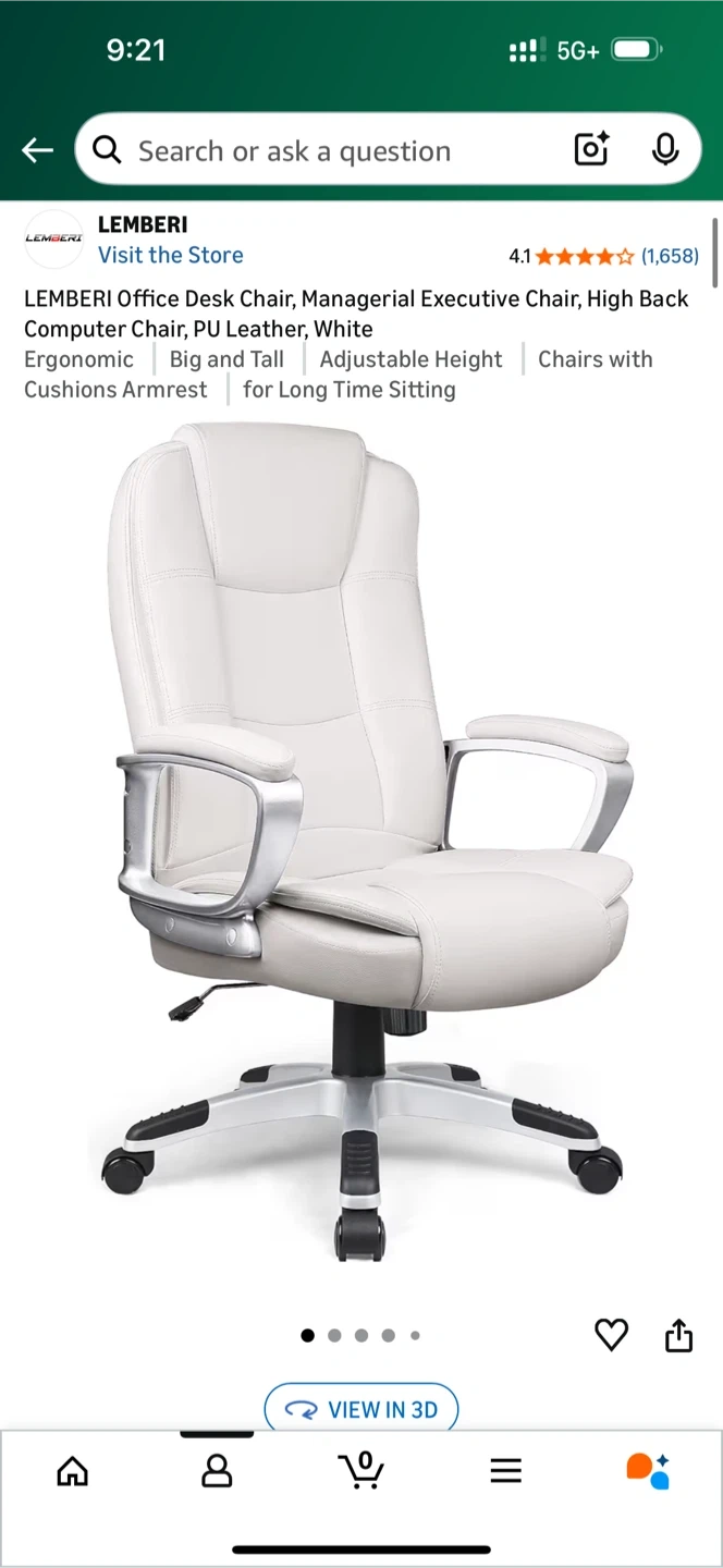 65Selling a LEMBERI office desk chair. It's a managerial executive chair with a high back, perfect for computer use. The chair is made of PU leather and comes in white. It's designed to be ergonomic and suitable for big and tall users, with an adjustable height and cushioned armrests for long time sitting ***Pick up only
