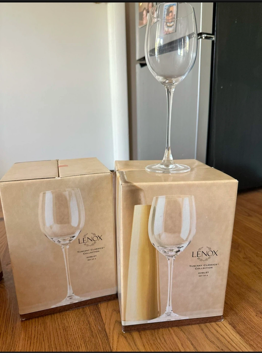 10Selling brand new, still in the box sets of Lenox Tuscany Classics wine glasses. Each set includes 8 glasses and comes in the original box. Perfect for entertaining or everyday use! 8 Balloon glasses, 8 Tulip white wine glasses, 8 Goblet glasses.