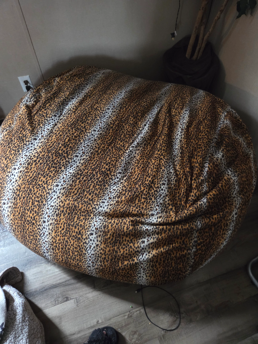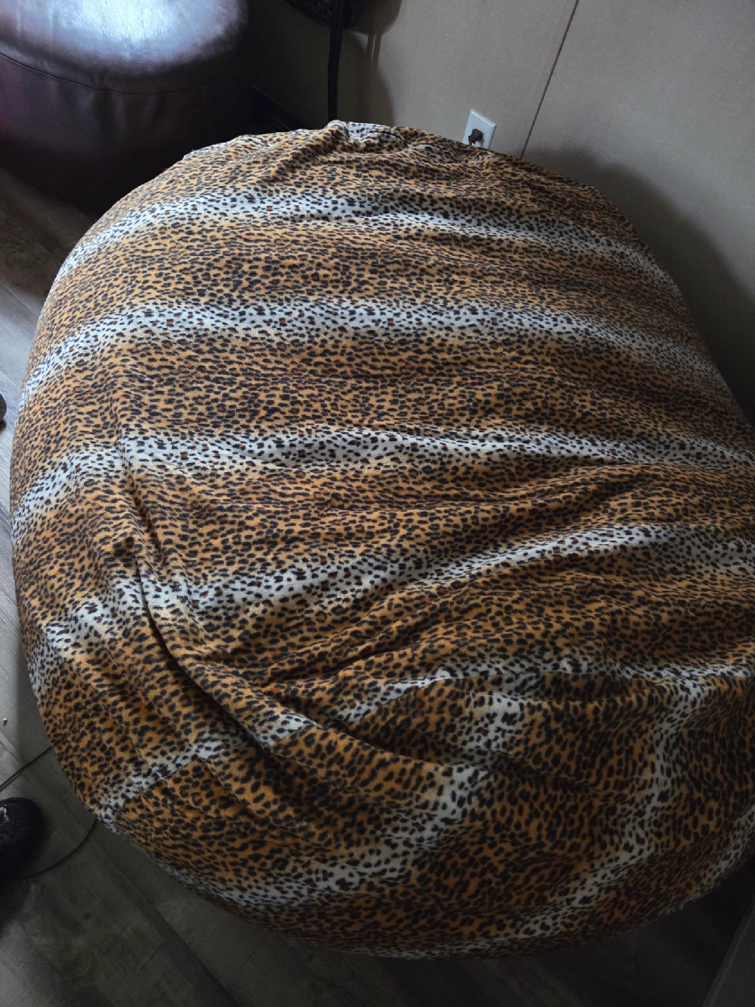 74This is a comfy bean bag chair with a fun leopard print! It's in good condition and ready for a new home. Perfect for lounging and adding a touch of style to any room
