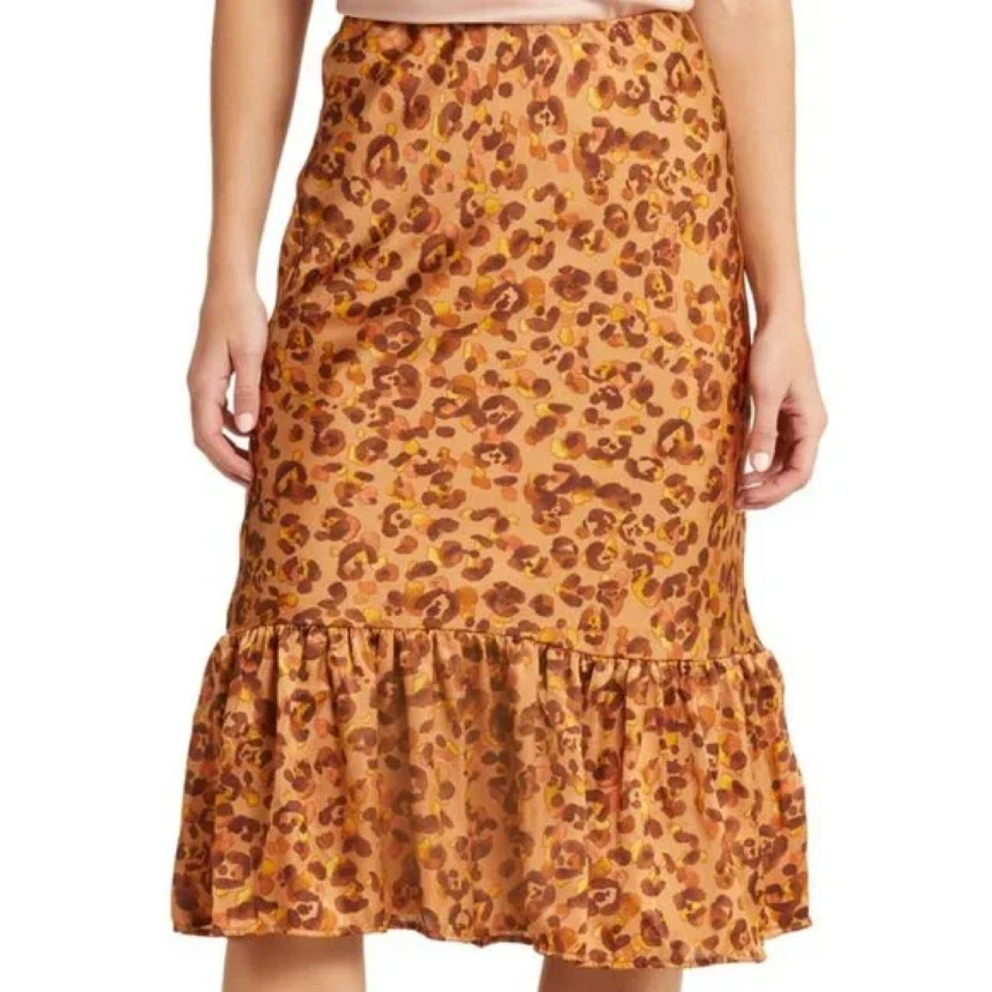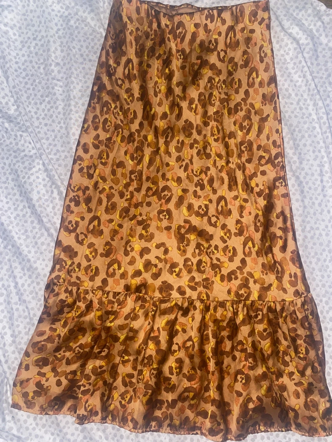 A cute midi skirt with a fun leopard print! It's perfect for dressing up or down. The skirt has a ruffle at the bottom. Only worn once