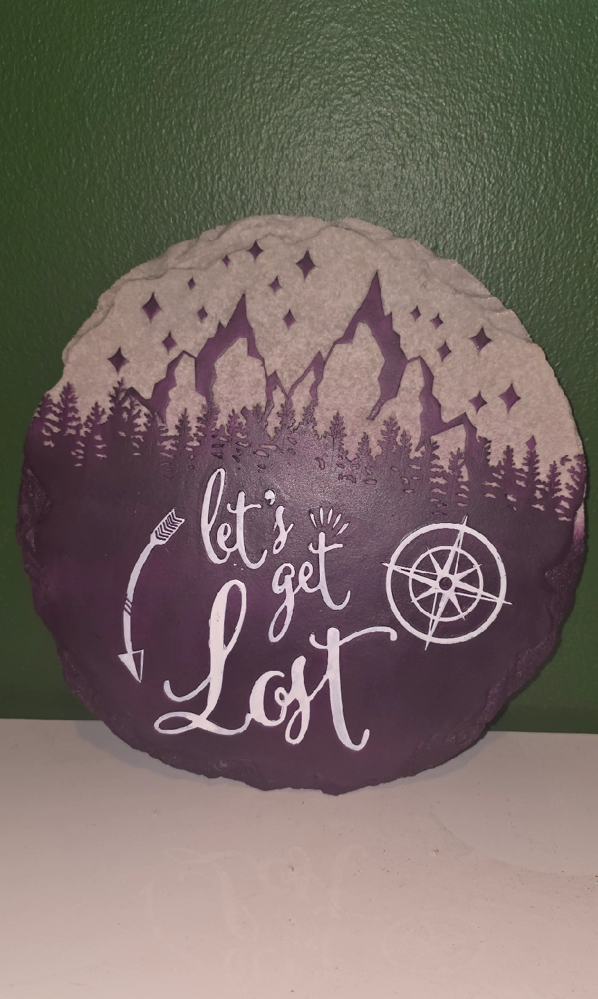 This is a decorative wall art piece featuring a mountain and forest design. The text "Let's Get Lost" is written in a playful script, accompanied by an arrow and a compass. It's a unique piece to add to your home decor. Lovely piece.