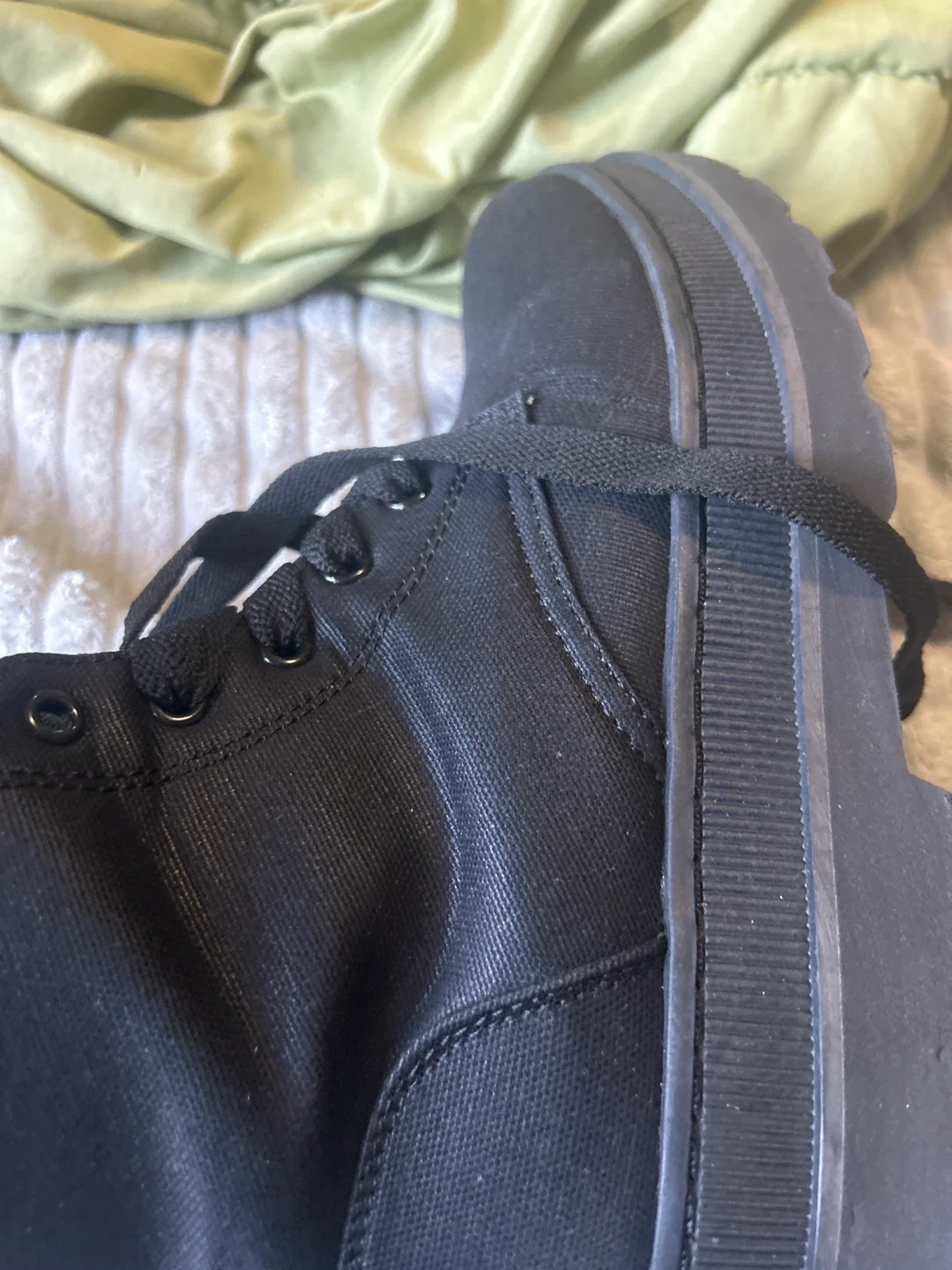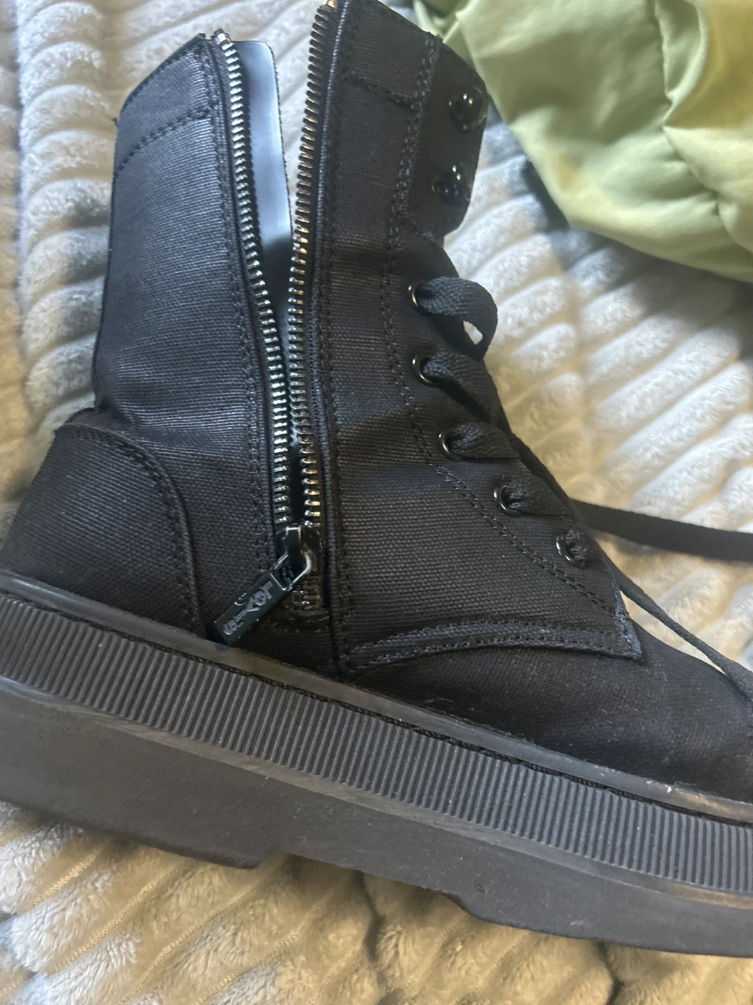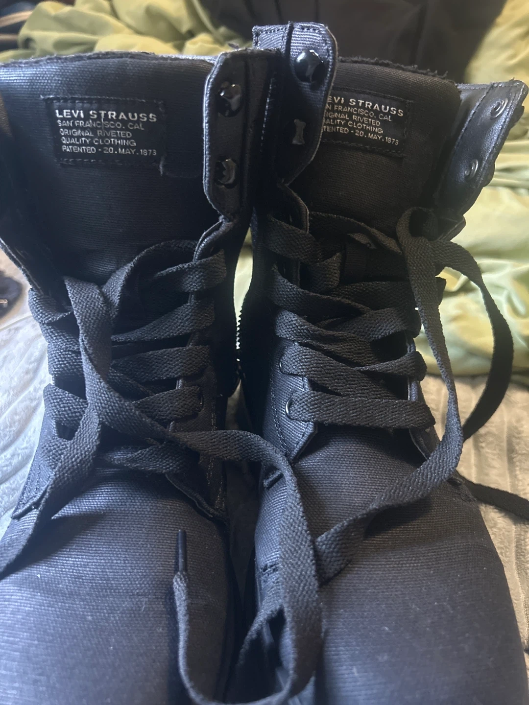 20Selling a pair of Levi Strauss combat boots in black. They are a women's size 8 US, 39 EUR, and 5.5 UK. These boots feature a textile upper and a stylish zipper detail on the side. Perfect for adding a bit of edge to any outfit!