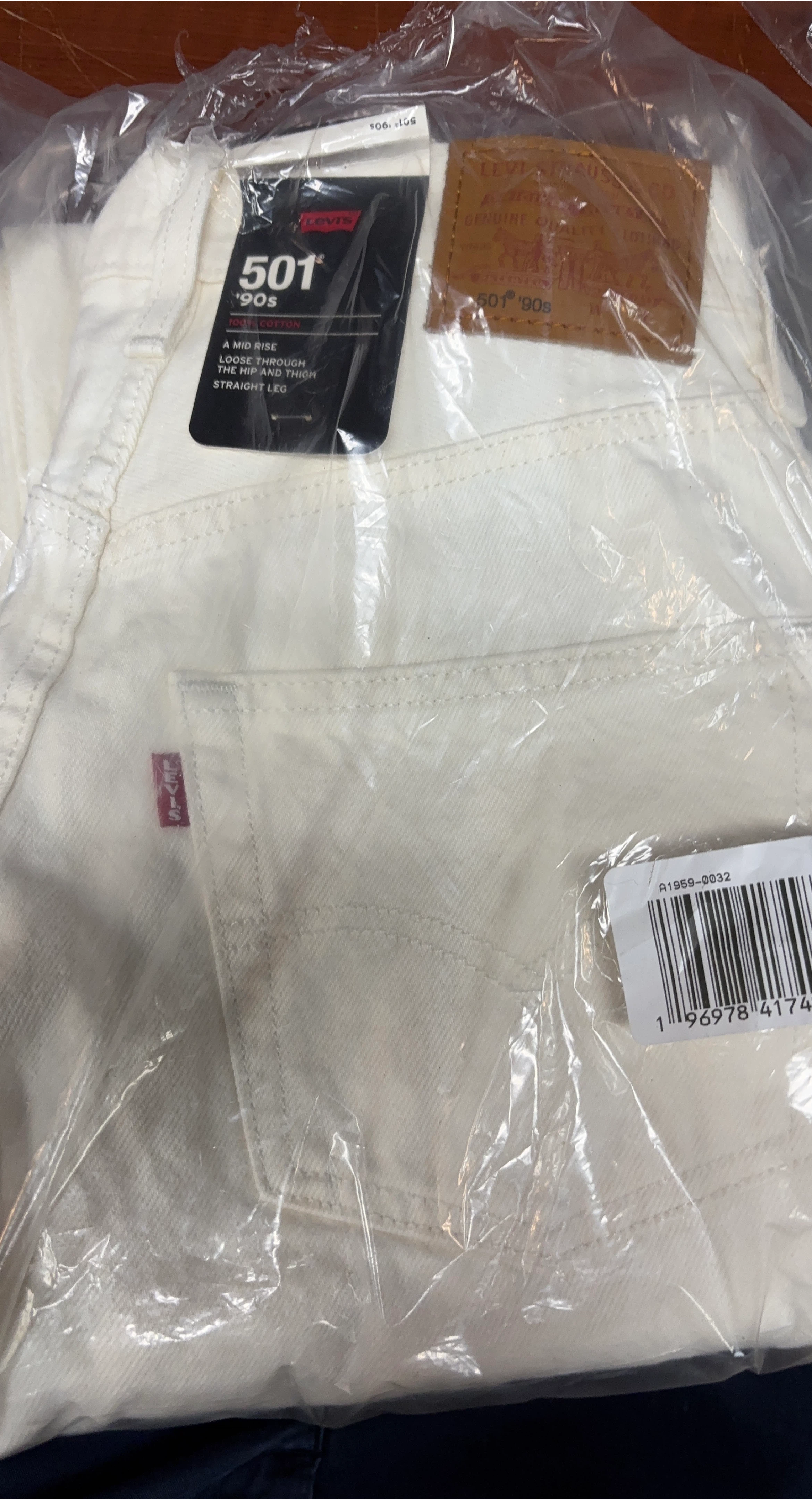 Selling a brand new pair of Levi's 501 '90s jeans in white! These are 100% cotton with a mid-rise, loose fit through the hip and thigh, and a straight leg. They're still in the original packaging