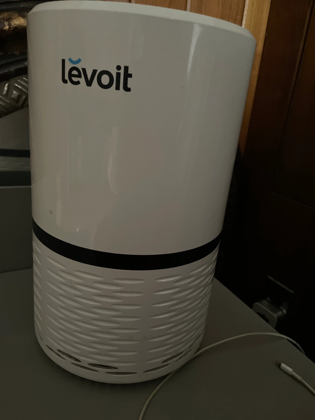 White air purifier. Looks like a cylinder. Has a black band near the bottom. Small holes at the bottom.
