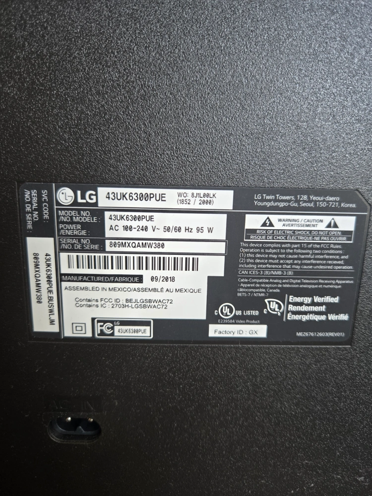 31Selling an LG 43UK6300PUE 43-inch 4K UHD TV. Key details: - Model: 43UK6300PUE - Power: AC 100-240 V ~ 50/60 Hz 95 W - Manufactured: September 2018 MOVING SALE, PICK UP ONLY!!