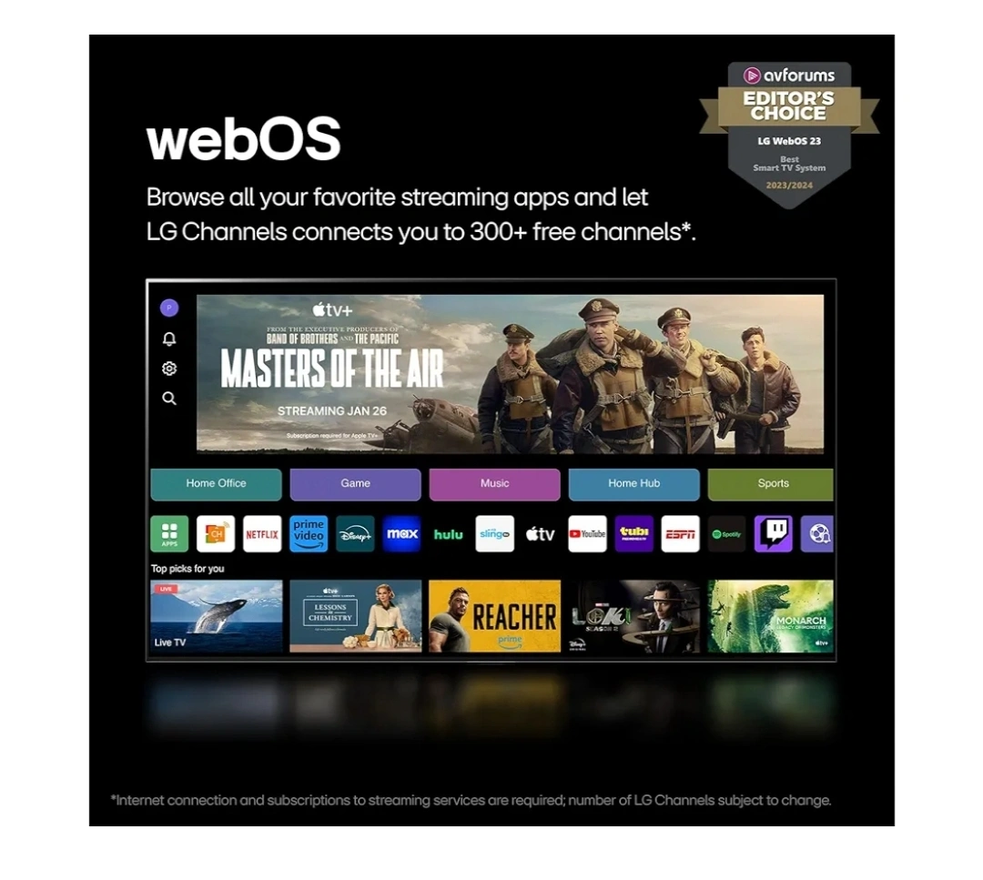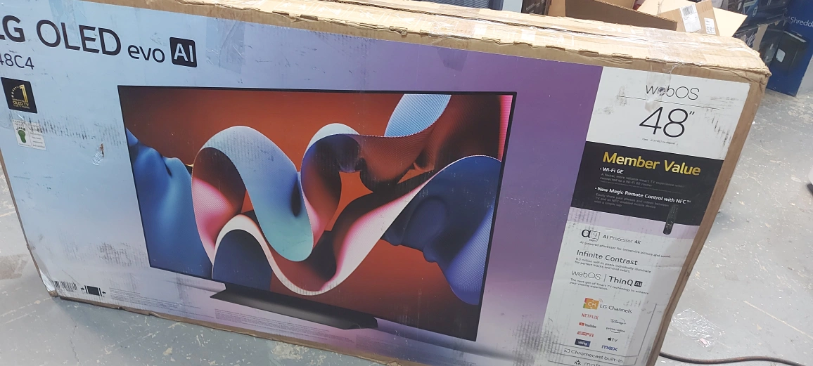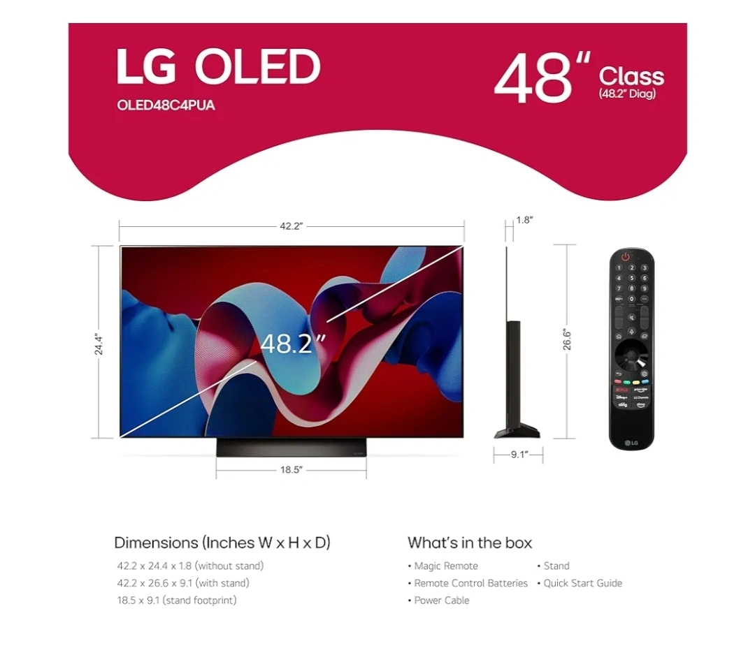 LG 48" Class C4 Series OLED evo 4K UHD Smart webOS TV SELF-LIT PIXELS: LG's signature OLED technology creates an incredible watching experience and stellar picture quality illuminated with over 8 million self-lit pixels. Take in rich and accurate colors from the brightest to darkest parts of the scene thanks to 100% Color Volume* and with 100% Color Fidelity. 144 HZ REFRESH RATE: Enjoy crisp, smooth visuals with a 0.1ms response time and up to 144Hz refresh rate. LG OLED TVs feature NVIDIA G-Sync, AMD FreeSync Premium, and VRR for enhanced gaming quality. With four HDMI 2.1 inputs, connect all your devices effortlessly. The LG Game Dashboard and Game Optimizer provide complete control whether you game on consoles or in the cloud. DOLBY VISION, FILMMAKER AND DOLBY ATMOS: Experience the magic of the big screen right from your couch. Every LG OLED comes loaded with Dolby Vision for extraordinary color, contrast and brightness, plus Dolby Atmos* for sound you can feel all around you. Land in the center of the action with FILMMAKER MODE, allowing you to see films just as the director intended. a9 AI PROCESSOR GEN7: The C4's exclusive processor is the brains behind a truly unforgettable TV experience. You'll get smooth, vivid picture no matter what you watch with AI Super Upscaling which automatically enhances picture quality whether you're watching sports, movies, or a late-night favorite. Multi View with 2 screens lets you split your screen into 2 unique views so you can watch even more than before, everything looks and sounds incredible on a LG OLED TV. WEBOS 24 & LG CHANNELS: No matter which TV you choose, your LG TV makes it easier than ever to find what you need and more. Browse all your favorite streaming apps and let LG Channels connects you to 300+ free channels of sports, fitness, cooking and more NEW with WARRANTY EASY FINANCING AVAILABLE