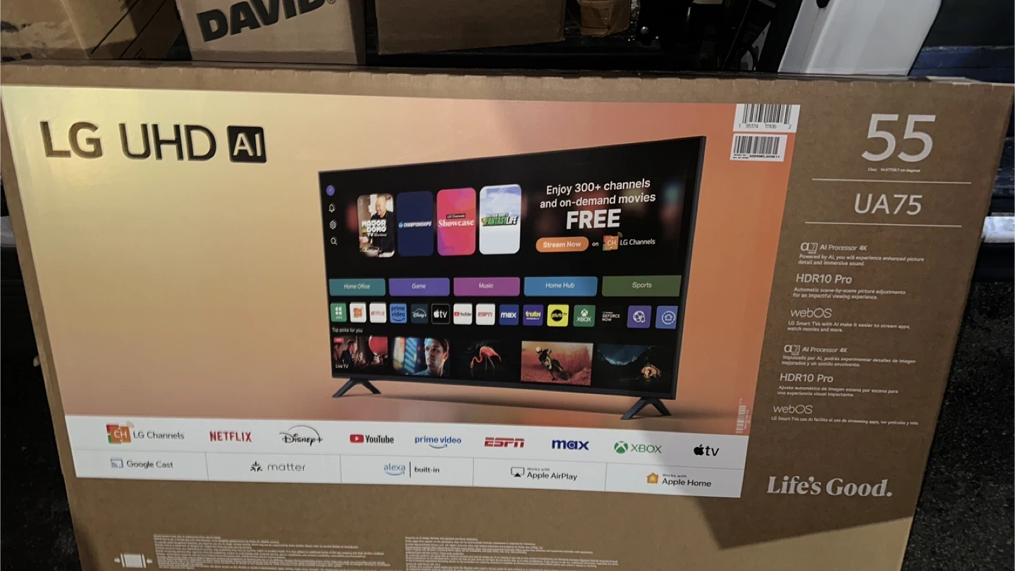 Selling a practically brand new LG 55 inch UHD 4K AI TV, model UA75! The box includes the TV and all original components. Enjoy over 300 channels and on-demand movies. It features an α7 AI Processor 4K for enhanced picture detail and immersive sound, plus HDR10 Pro for automatic scene-by-scene picture adjustments. LG Smart TVs with webOS make it easier to stream apps and watch movies!