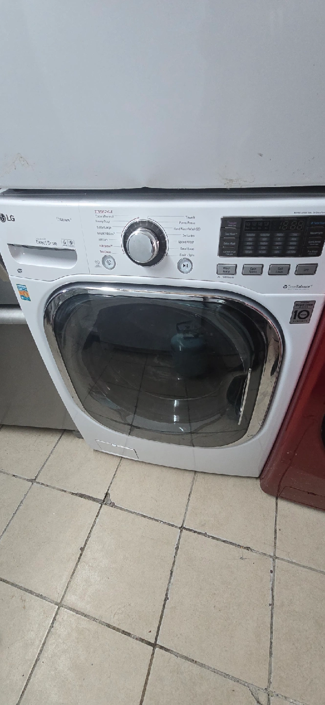 10Selling an LG Direct Drive washing machine. It's in good condition and ready for a new home. It features a steam cycle and several wash programs for different types of loads, including delicates, heavy duty, and bulky/large items. The machine also has a TrueBalance anti-vibration system