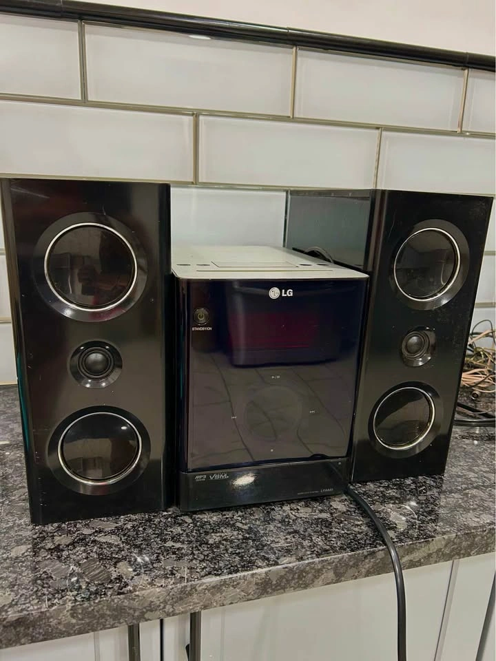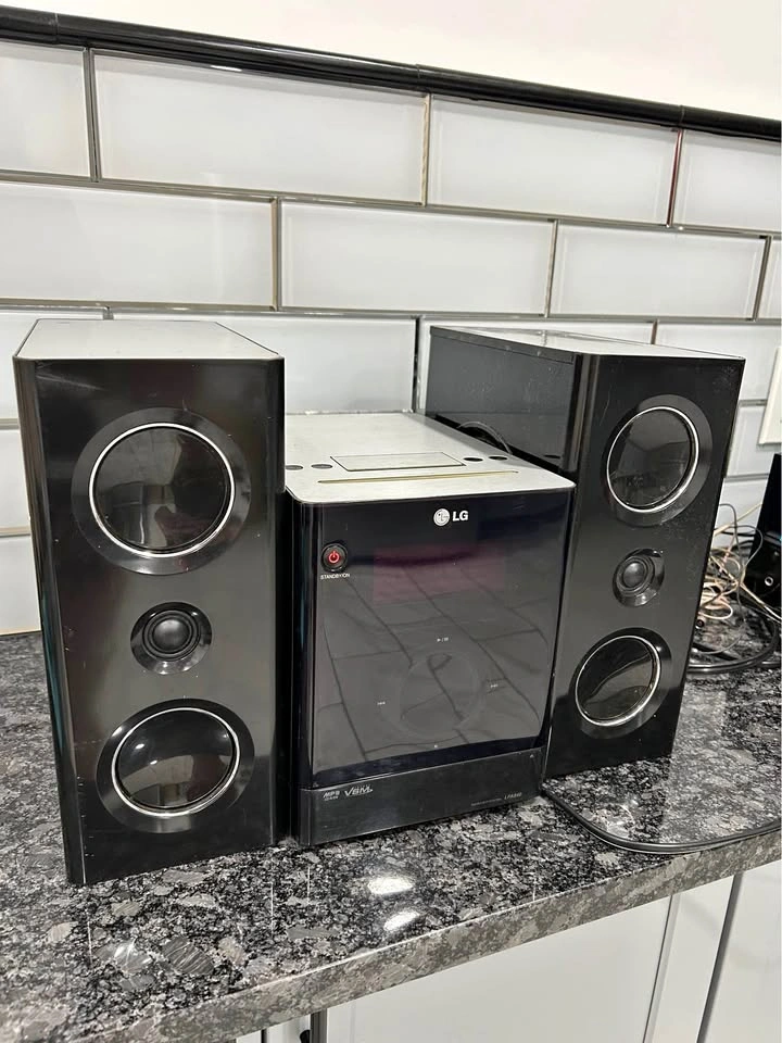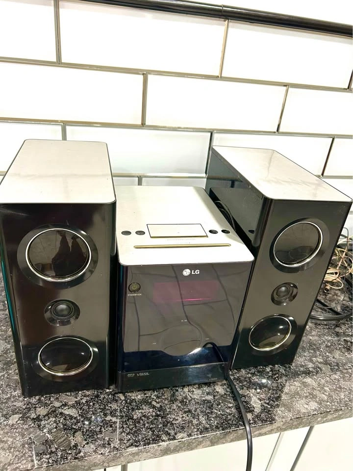 15Total power output of 160 watts. It can play audio CDs, DVDs, and discs with MP3, WMA, JPEG, and DivX files. It has a USB port that allows for direct recording from a CD to a flash drive. The system includes an iPod dock for connecting and playing music from an iPod.