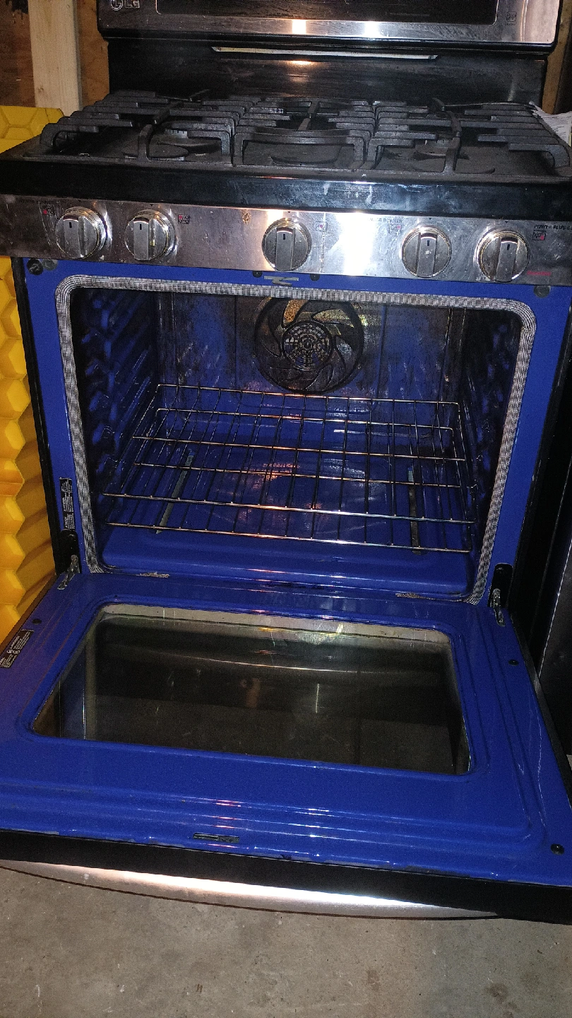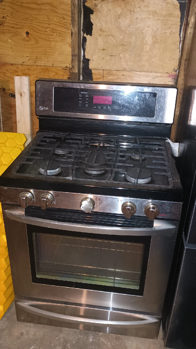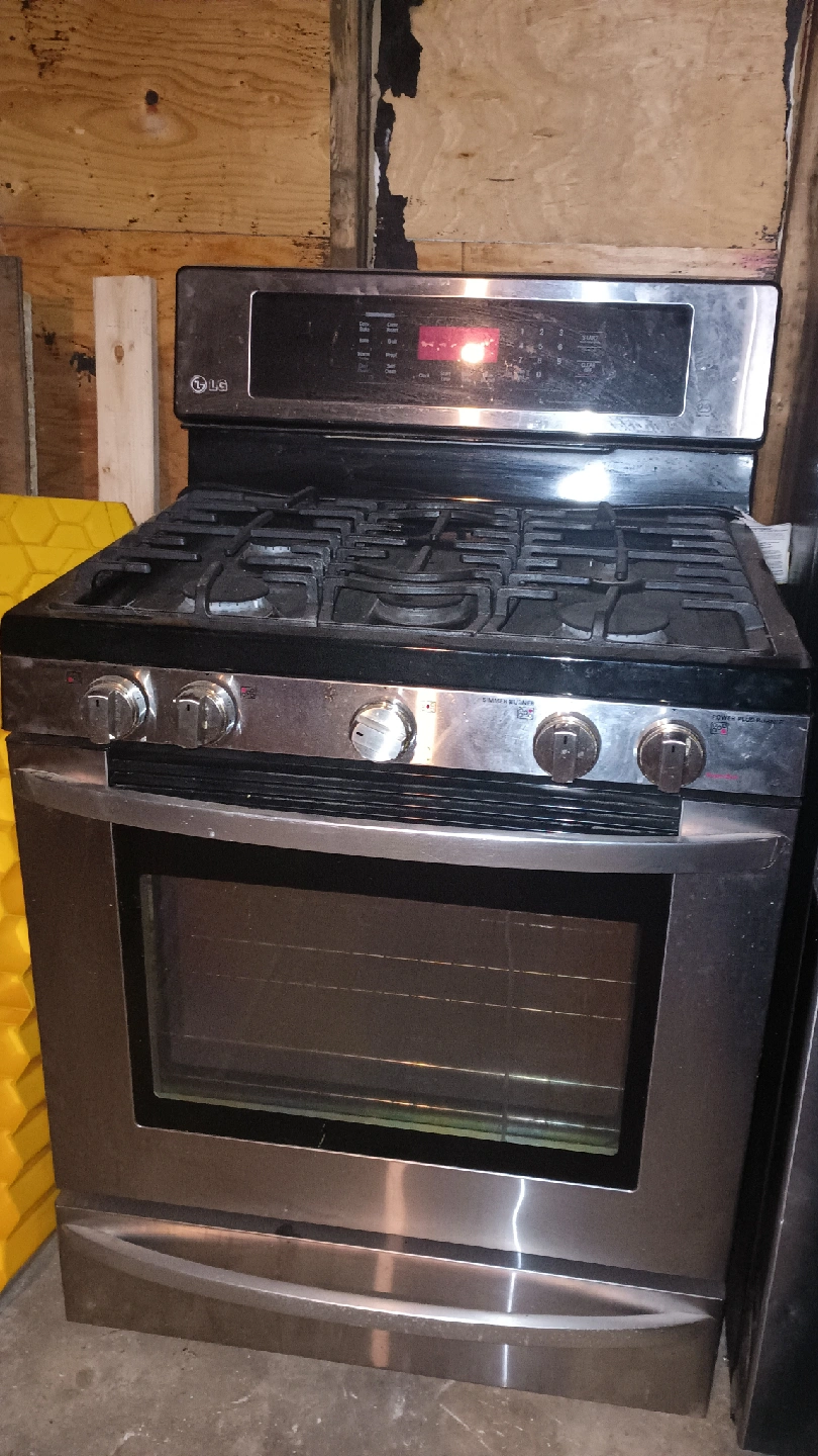 10Selling a used LG gas range in stainless steel. It features a cooktop with multiple burners and an oven with a blue interior. It shows signs of use, but it's still functional and ready for a new home!